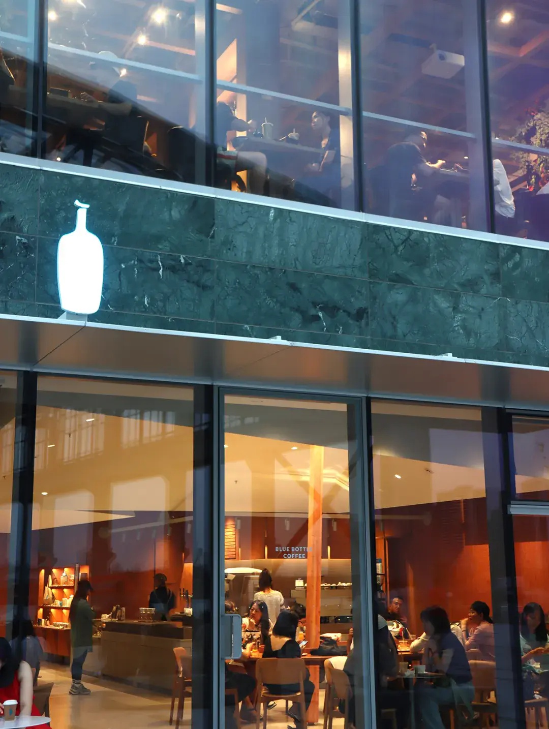 靠近船坞的Blue Bottle Coffee 蓝瓶咖啡,空间主要以水泥和木质两种材料打造——这正是原址上海水泥厂和对面的江岸运输码头船坞(梦船坞)标志性的两种建筑材料,在蓝瓶这间新店里完成了和谐交融。这里也是光影秀的“一线景观位”!