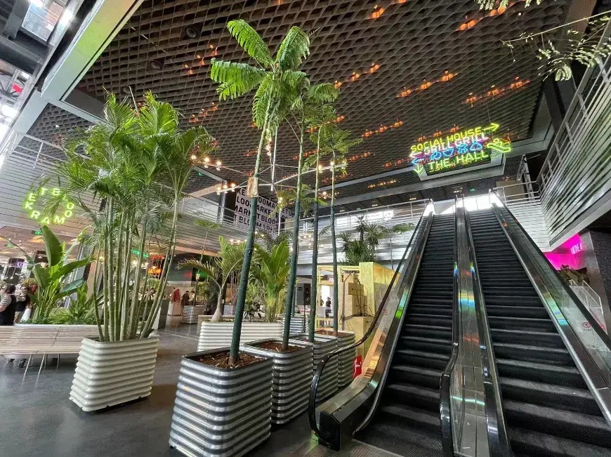 由独栋厂房改建而来的最大“盲盒”——8号楼1—2层的BLOOMARKET风味实验场,最大程度地保留了原始工业建筑风,室内植物郁郁葱葱宛如热带雨林,树影中“栖息”着胡麻、CUCURUCU、SHAN在内的10余个独立餐饮品牌,从传统西餐到新派中式融合菜再到饮品轻食,让你一次吃个遍,感受在地和远方、风土与创意、城市与市井、山野与世界的潮流碰撞。