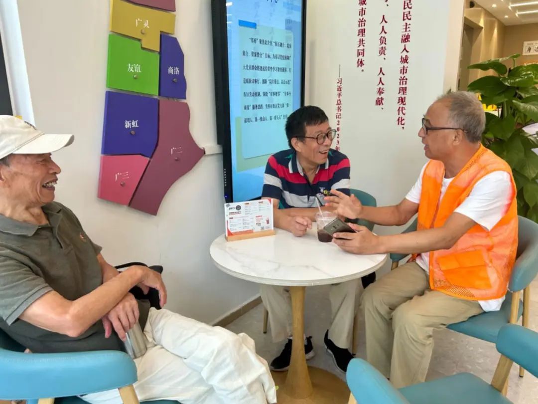 陆荣康带着记者来到小区里的中心花园,下午三四点不少居民在此聊天休息。他不无自豪地说:“现在人还不算多,晚上还要热闹呢!”与改造前的陈旧大不相同,如今宽敞美观的中心花园已经成了邻里社交的关键空间。在街道北片区邻聚力街区党支部和居民区党总支的组织下,这里举办了多场大型活动,不仅面向居民,也面向附近商铺、新兴领域工作者,促使街区邻里互动、资源导入,从而赋能“围墙内外”融合治理。