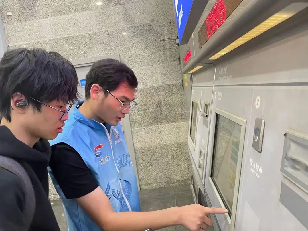 晚上九点左右,一位外国友人焦急地向我们寻求帮助。他表示想要乘坐地铁,但是还没有中国的网络,也无法使用支付宝线上买票,也没有零钱在线下买票。通过简单的沟通,我随即让外国友人连接自己的手机热点,并引导其在自助购票机上顺利完成购票。问题解决后,外国友人焦急的情绪大有缓解,双手合十向志愿者表示感谢。这样的温暖瞬间在这一天不断发生着。