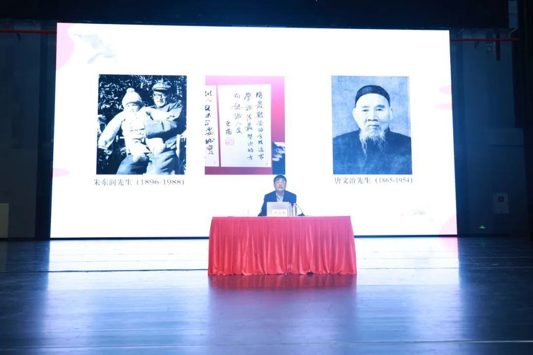 授课伊始,陈尚君展示老师的旧照片与这句题词,与师生共勉。他从朱东润先生及其老师唐文治先生等老一辈学者的治学造诣与人格风范切入,将师生服膺并追求的传统学术娓娓道来。