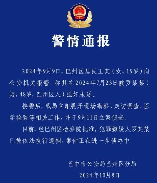 10月8日,巴中市公安局巴州区分局发布警情通报,通报显示:2024年9月9日,巴州区居民王某(女,19岁)向公安机关报警,称其在2024年7月23日被罗某某(男,48岁,巴州区人)强奸未遂。目前,犯罪嫌疑人罗某某已被依法执行逮捕,案件正在进一步侦办中。