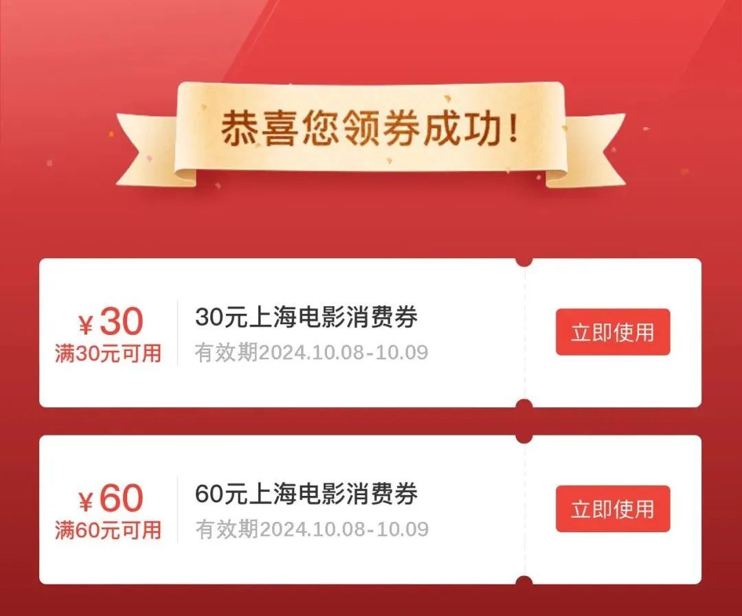 市电影局介绍,2024“乐影上海”电影消费券第二阶段开启!新阶段您的领券次数现已重置,第二阶段的领券机会不要错过咯!工作日普惠类电影消费券及文娱联动类电影消费券已上线。以上两种消费券,单人观影可优惠30元,双人同行更可优惠60元。详见↓