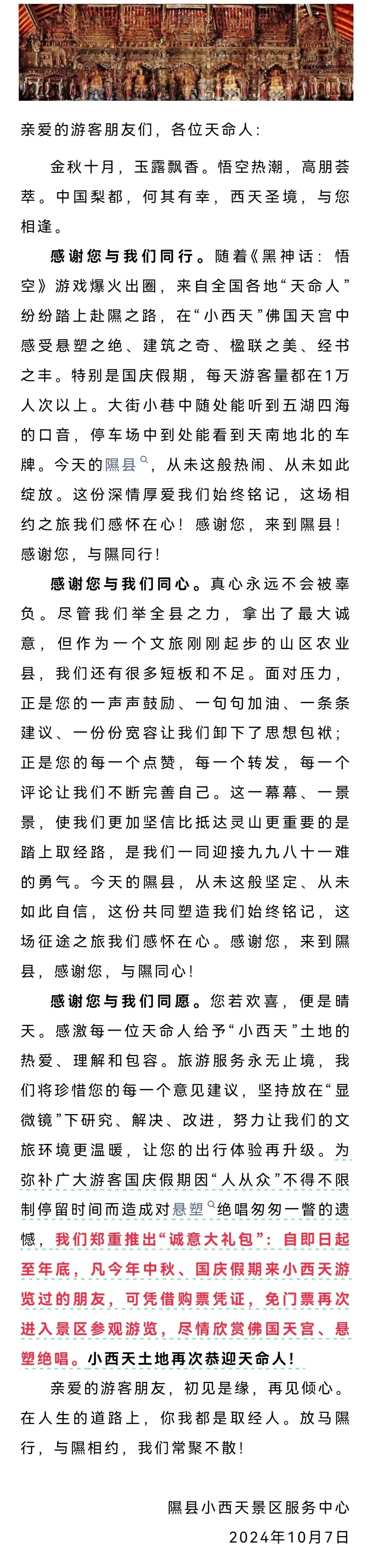 隰县小西天景区服务中心披露,国庆假期,每天游客量都在1万人次以上。由于太火爆造成拥堵现象,10月3日-10月10日,景区实行分批次游览,每批进入40人参观,每天接待游客上限为10000人。