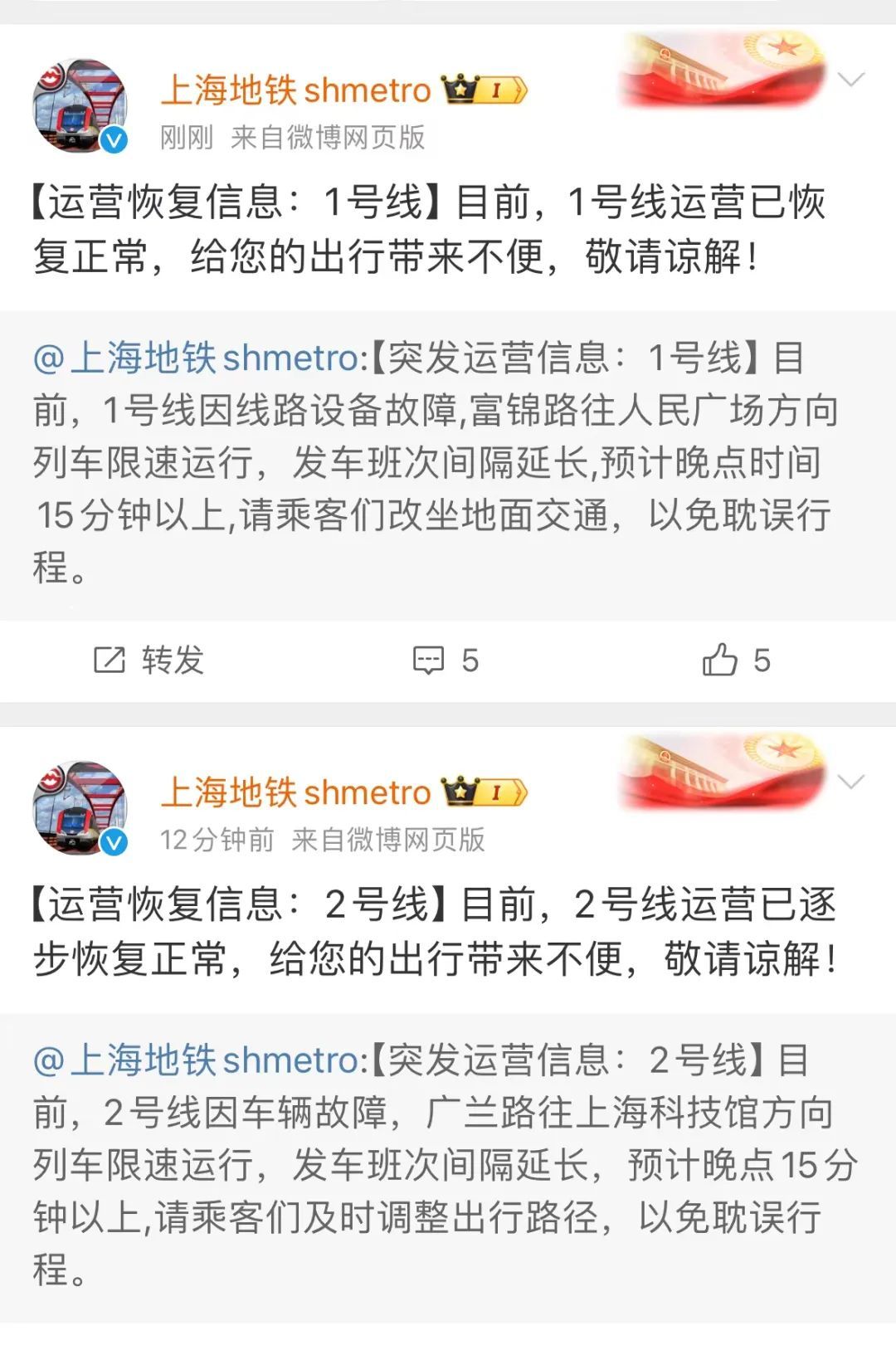 1号线、2号线均已经恢复运营