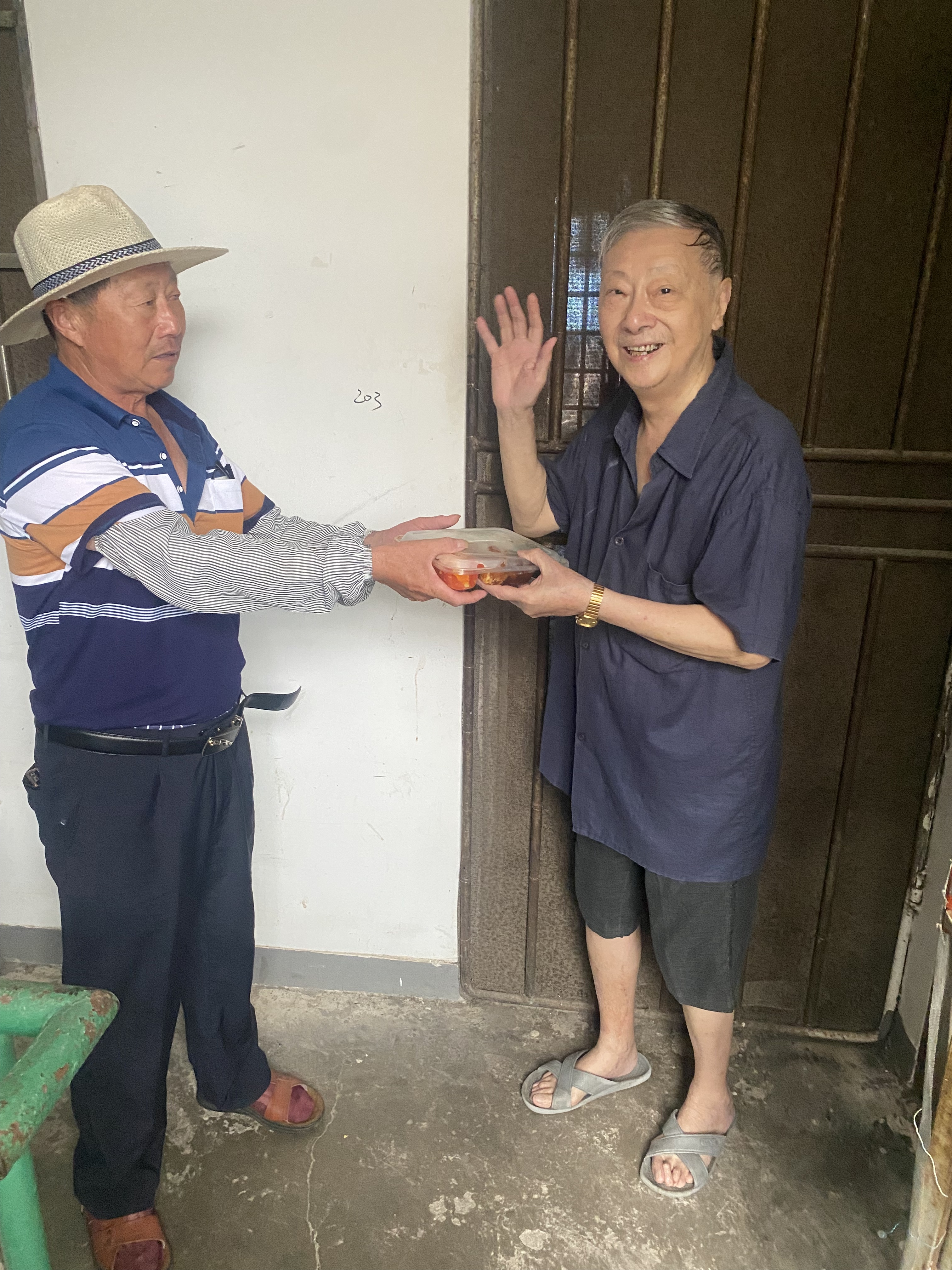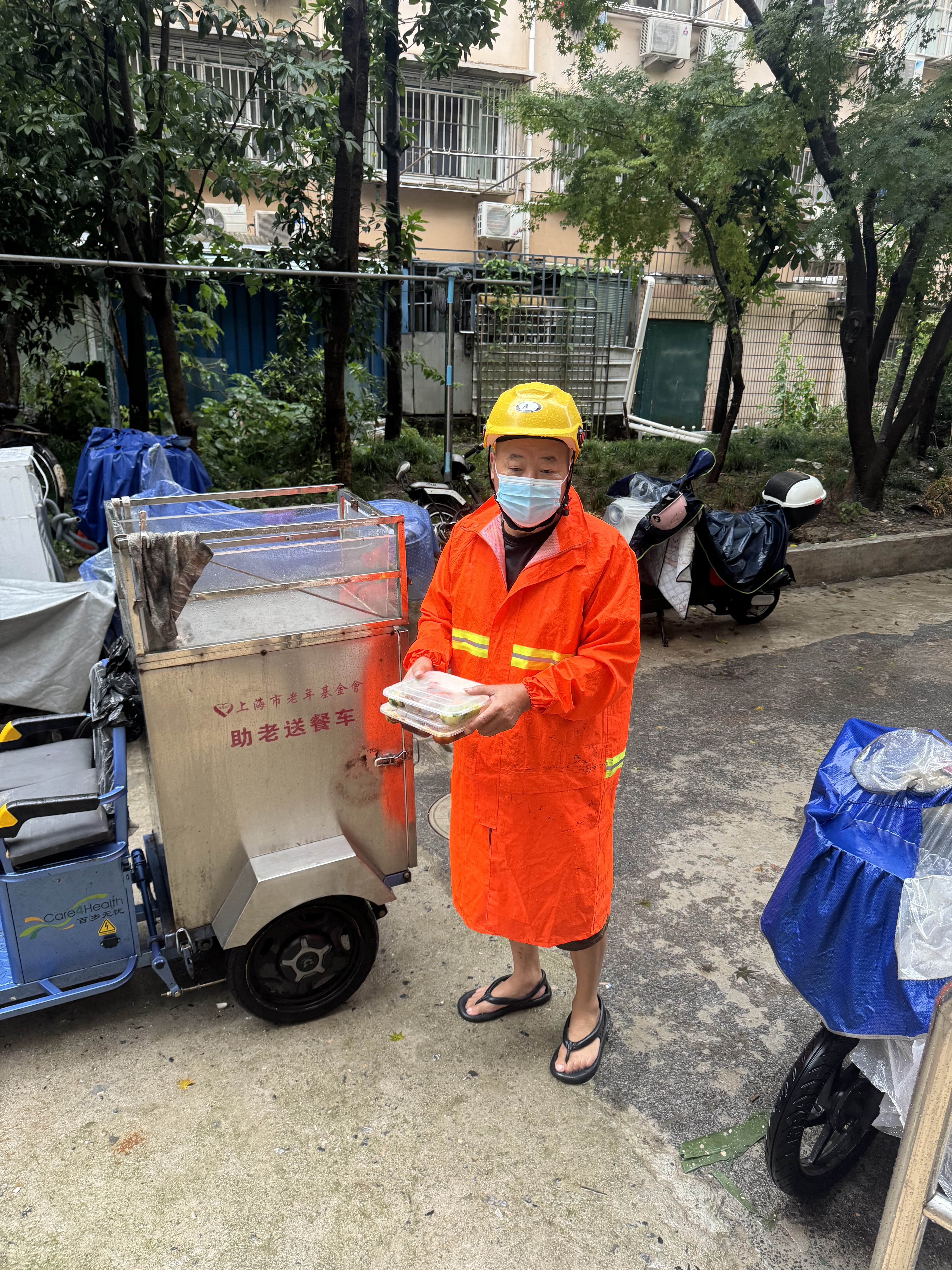 临近中午,芷江西路街道送餐员熊金根带着热腾腾的饭菜,走进芷江西路802弄38号楼居民石老伯、夏阿姨家,为他们送餐上门。