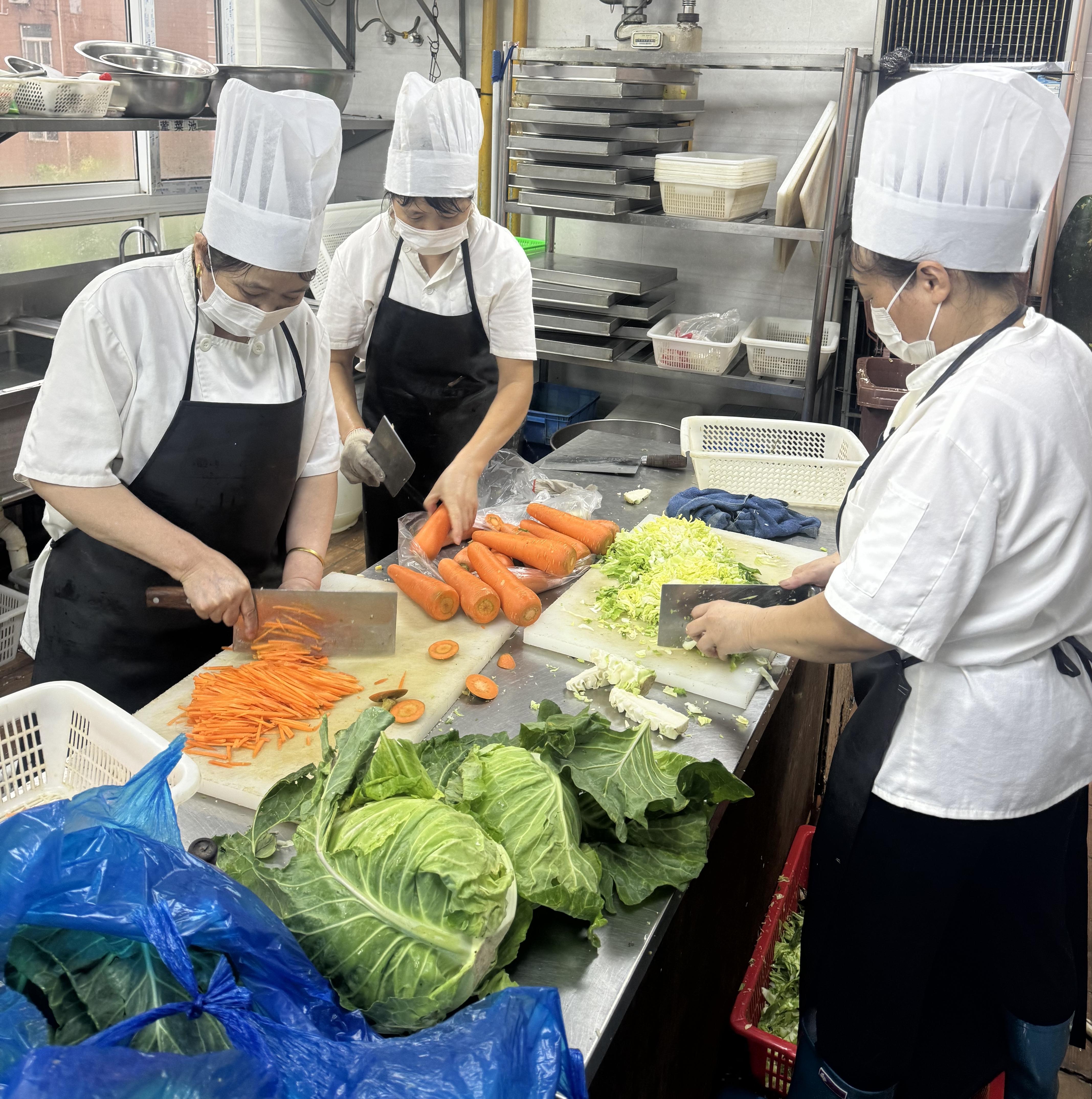 为了能让老人准点吃上这一口热乎饭,一大清早,芷江西路街道徐家宅93号长者食堂的师傅们就开始忙碌起来。大盘鸡、咕咾肉、糟溜鱼片、虾仁炒蛋……一道道菜品在厨师的翻炒下火热出锅。