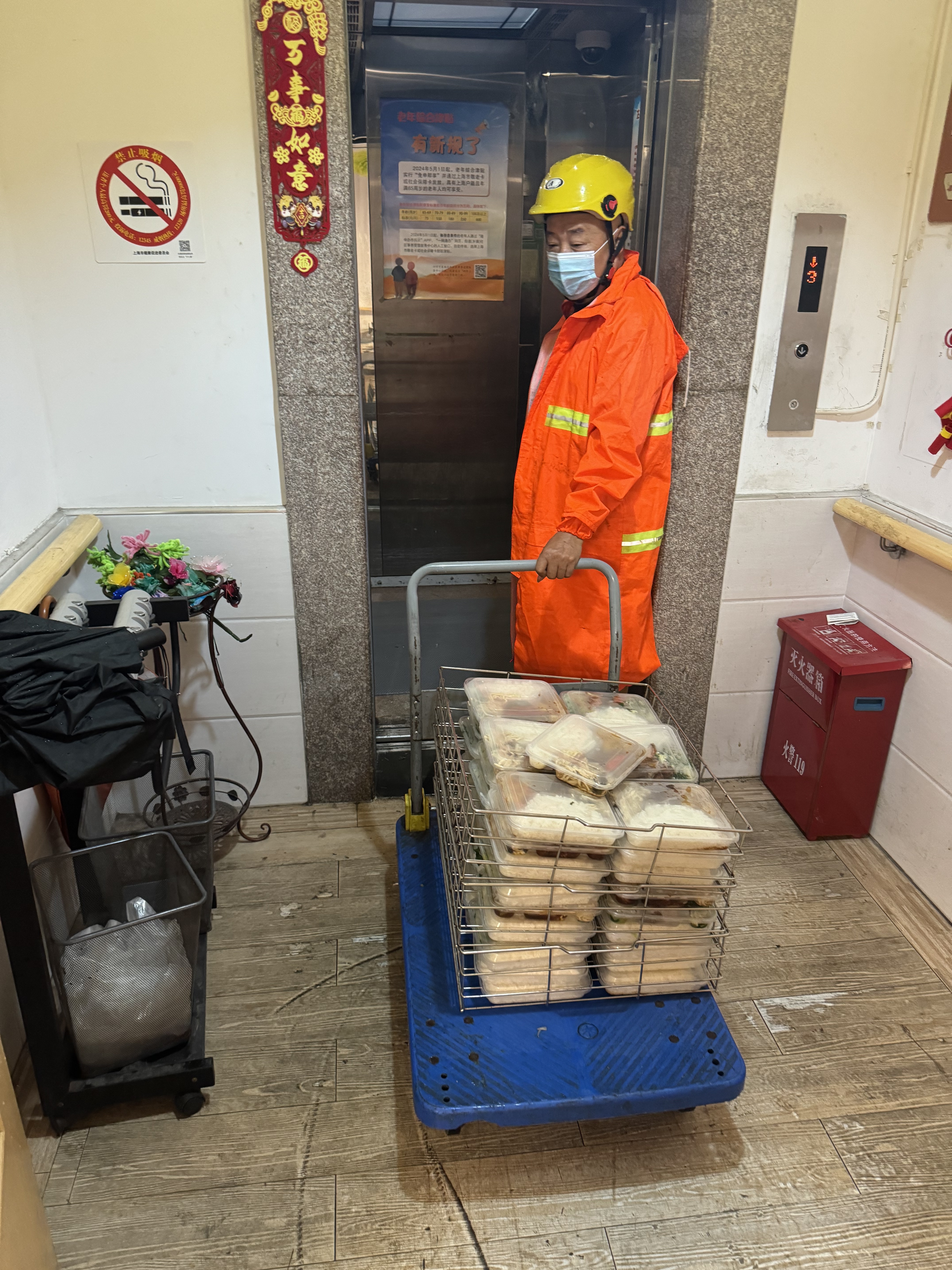 不少老人家住四楼以上,也没有电梯,送餐员们需要上上下下爬好多次。马俊红的辛劳也被居民们看在眼中,感动在心中:“你这样一家家爬楼送餐,上上下下几十趟,真的很辛苦啊!”这时马俊红就笑说:“现在爬楼这点苦不算什么,你们按时吃上饭更重要!”