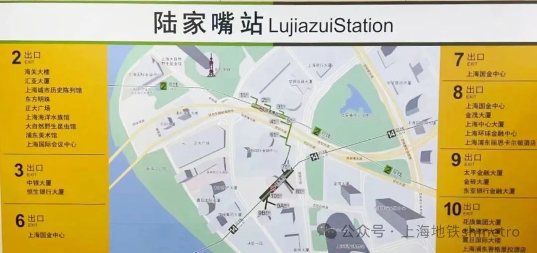 根据陆家嘴站周边标志性建筑和商圈地理位置,定制了专项引导标识,使出站乘客能够第一时间“看得见导向,看得懂导向”,方便乘客了解所处位置和对应的出站通道,进一步提高客流引导能力和通行效率。