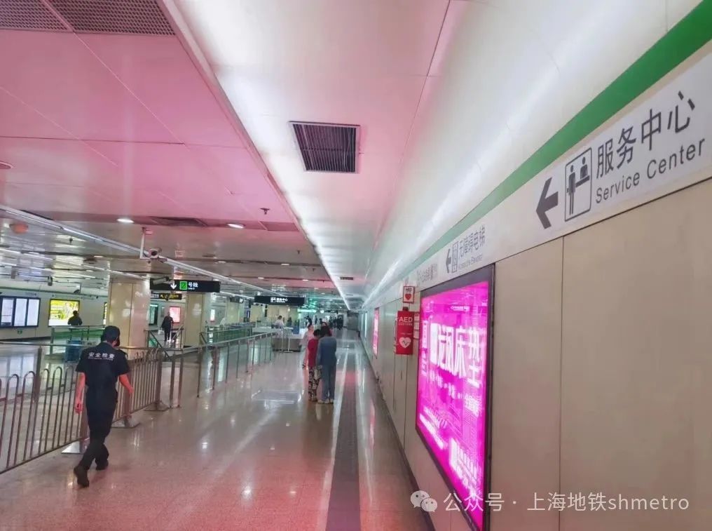 改造后的导向焕然一新。调整后的各处进、出站闸机上方的悬挂式导向“进站验票”“出站验票”清晰明了;站厅费区内、外的墙贴式导向为乘客提供了连续性指引,便于乘客快速获悉进、出站信息;位于站厅中间的“服务中心”配套的悬挂导向也一目了然,值得一提的是改造后的车站服务中心调整为高低服务台,更加方便了有需要的乘客使用。