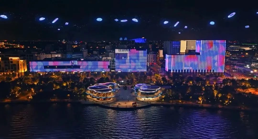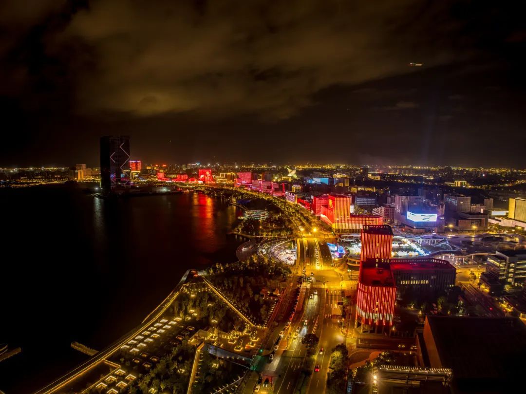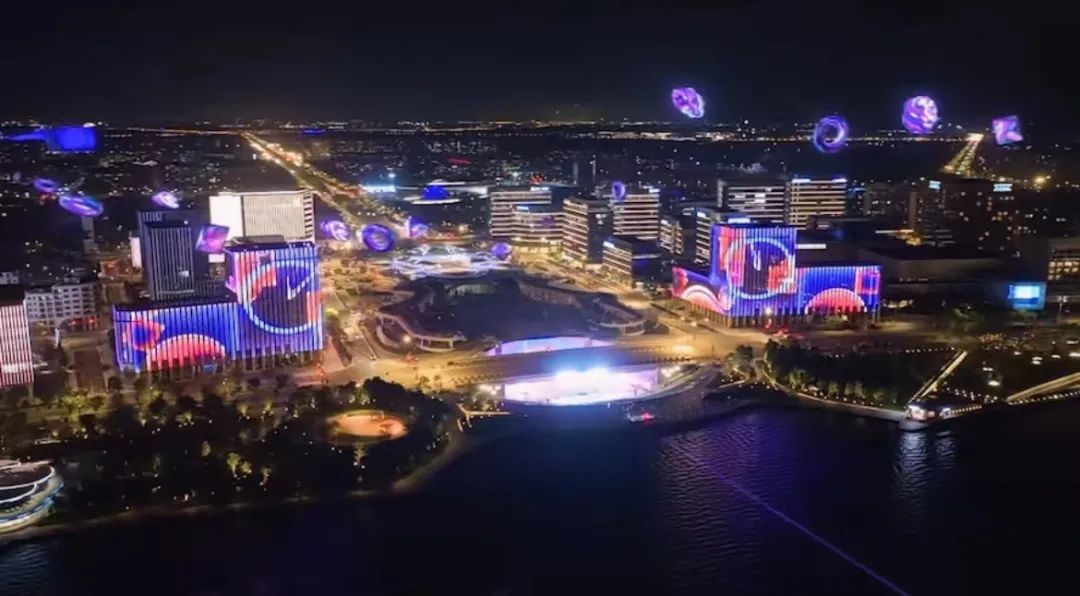 随着光影指针的转动,环湖的一栋栋楼宇被逐一点亮,绽放出璀璨变幻的灯光。