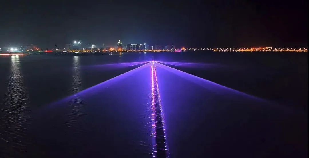 夜幕中的滴水湖幻化为了一张巨大的光影幕布。从湖心雕塑发出几道高耸入云的光束,如同指针般在形似表盘的湖面上一圈圈扫过。