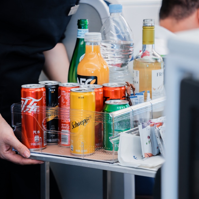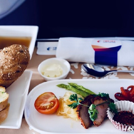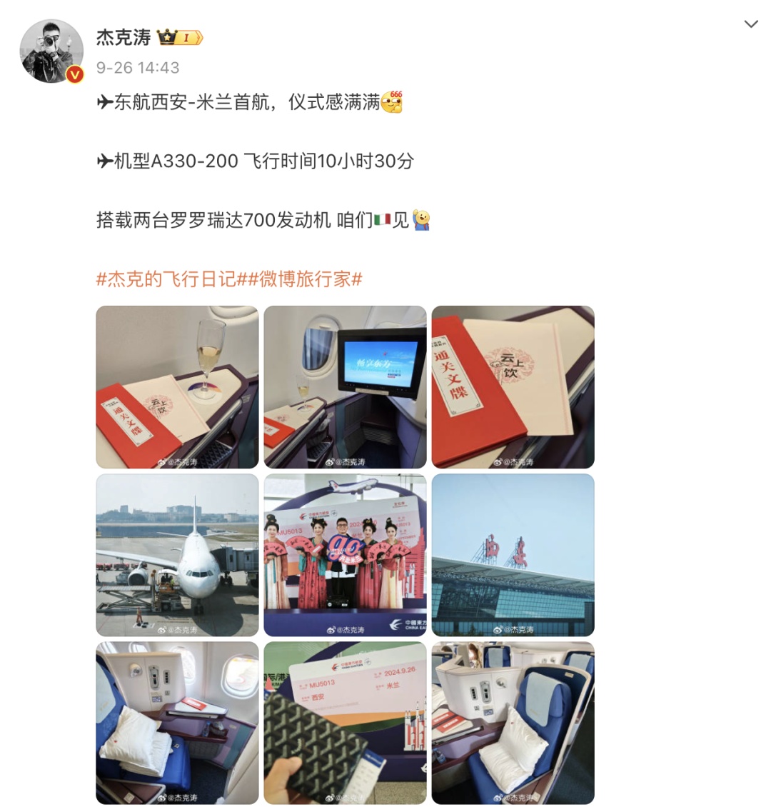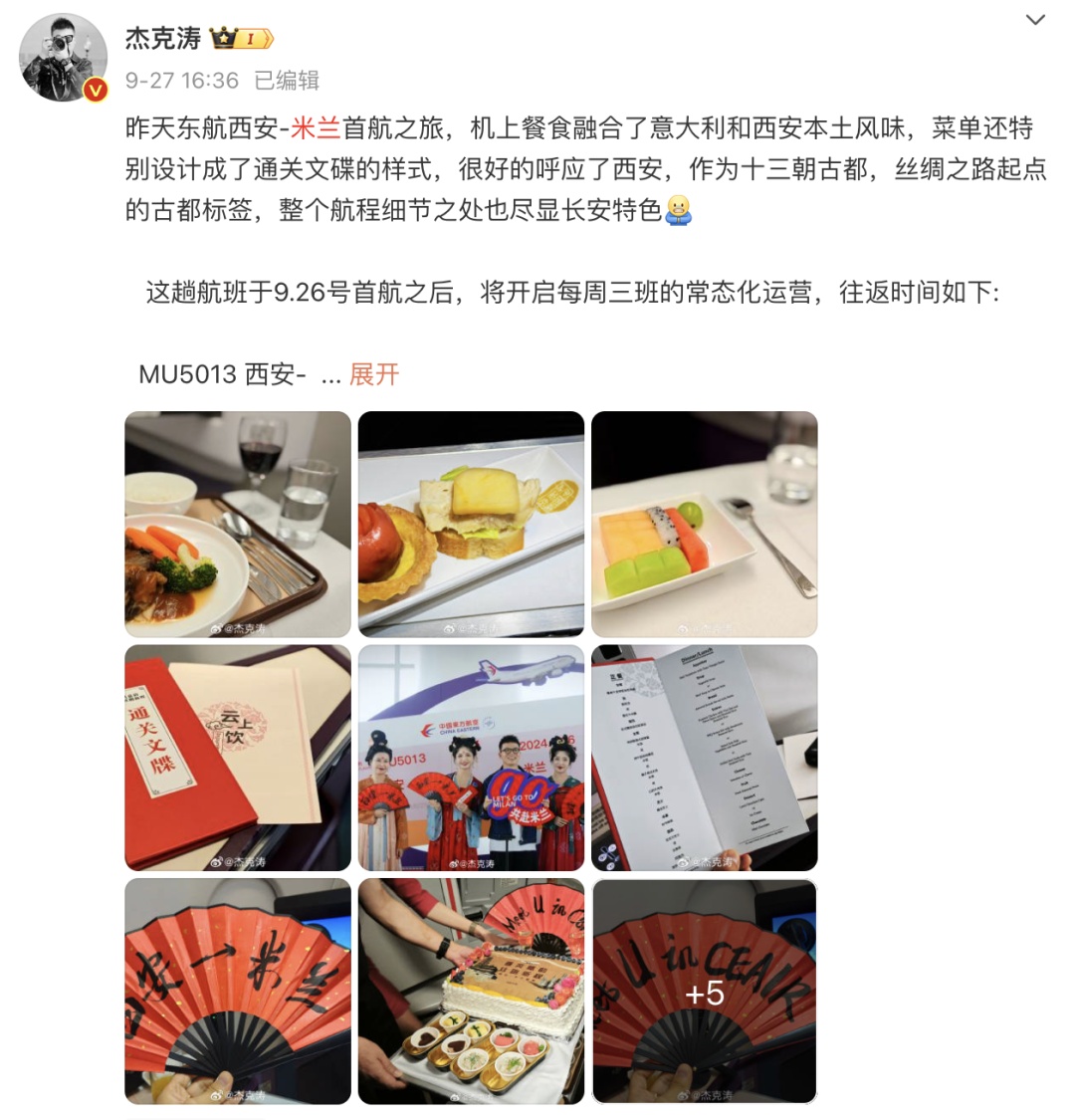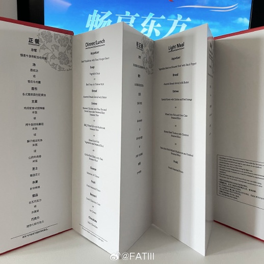 航班上配备了东航天厨匠心打造的机上美食。从开胃面包到餐后甜品,再到琳琅满目的酒水单,多样化的选择满足不同旅客的需求。“西安-米兰”的航班上菜单还采用了“通关文牒”的创意巧思,尽显东方风韵。