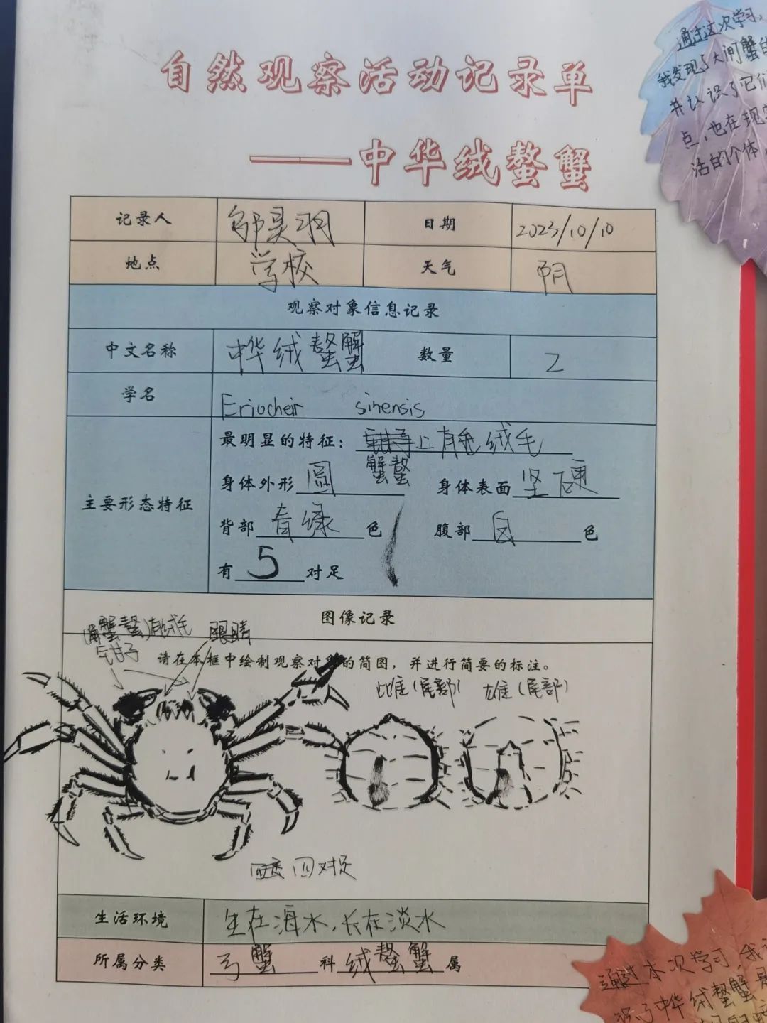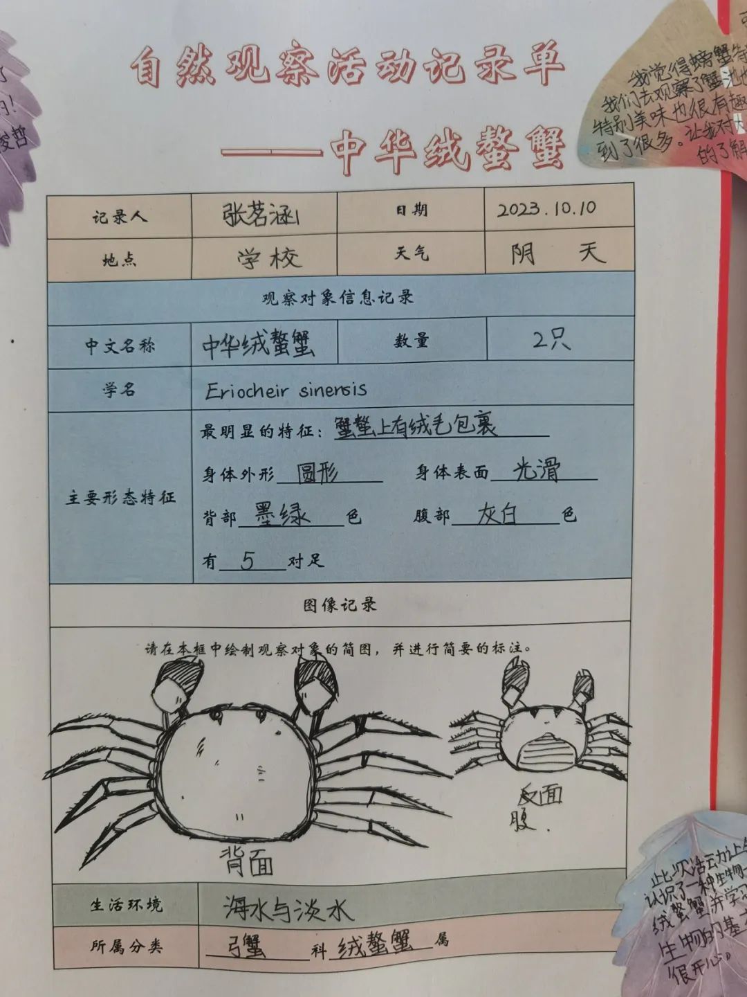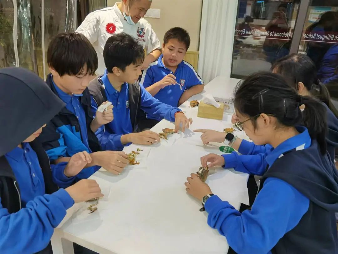 除了蜗牛,崇明蟹也“从未缺席”。校长李海林介绍说,每年相关负责老师都会去长江头收集蟹苗,然后带到学校的农场里喂养,在10月、11月,学生纷纷自己动手抓蟹,再带到在课堂上进行解剖、观察,还有机会品尝到自己亲手养殖的蟹。