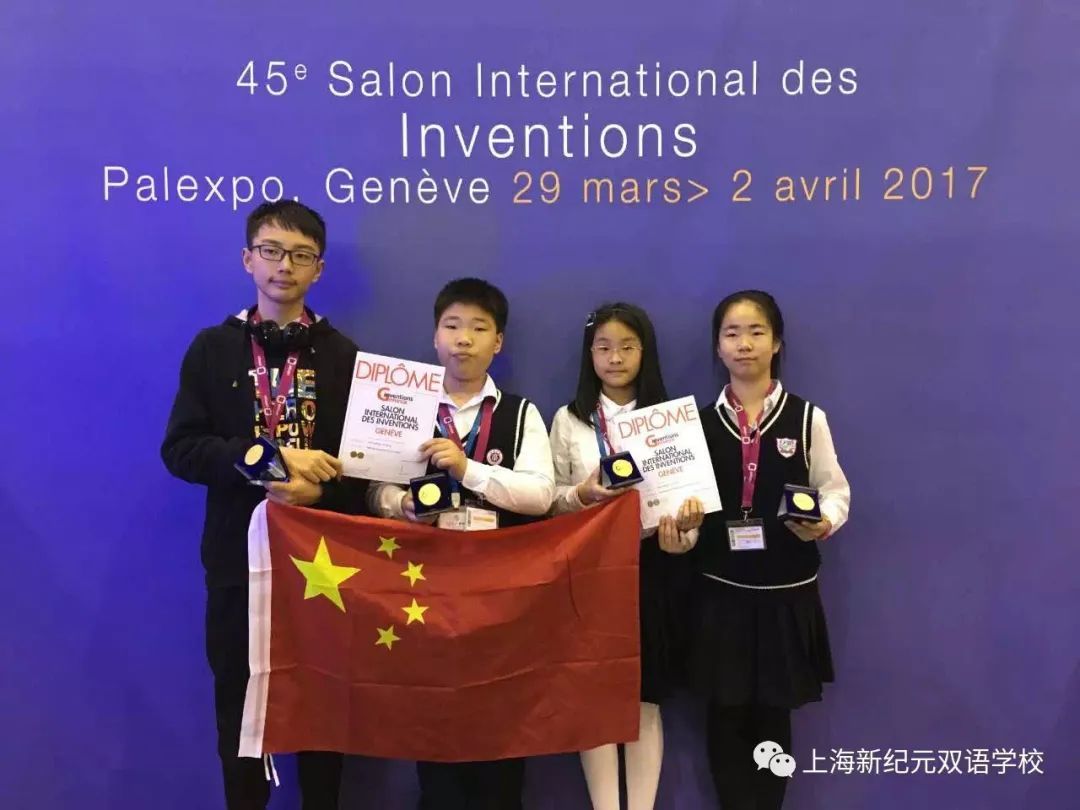 2017年上海新纪元双语学校初中部学生陈凤耘、唐文铎、沈馨雨、汤子垿团队携项目《Wind-Force Pressurization and Solar Energy Complementary Generator风力增压与太阳能互补发电装置》在第45届日内瓦国际发明博览会中获能源和创新实践金奖,他们是所有参赛选手中年龄最小的。