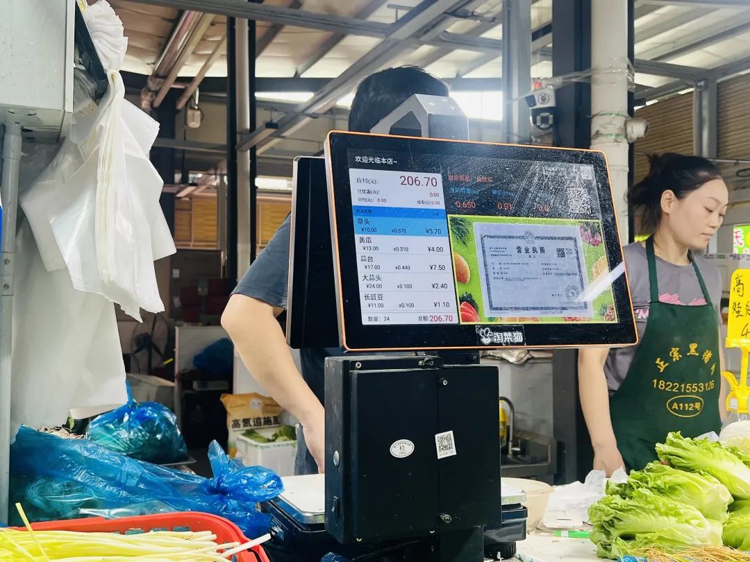 在蔬菜和水果摊位上,AI智能识别电子秤实现了全覆盖。不仅能自动识别交易菜品的品名、单价、重量和总价等信息,实时采集、汇总显示在屏幕上,经营户还可以通过智能秤商户端小程序,了解每日销售数据,精准调整进货策略,提升摊位的营收率。“原来传统称重结算我们需要手动输入各个菜品的单价,现在这个AI智能识别电子秤,自带AI识别探头,可以自动匹配对应菜品的菜价,遇上买菜客流高峰时,结算更快速便捷,消费者等待的时间缩短了。”一位蔬菜商户介绍说,同时电子秤的结算、交易数据实现了和菜场移动端小程序“云管家”的互通互联,摊位的销售情况、进销存管理、数据分析等都可以从中看到,更有助于进货时精准匹配市场需求,为商户经营降本增效。