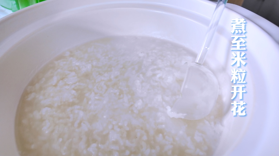 大米倒入锅内,加水,用大火煮至米粒开花。