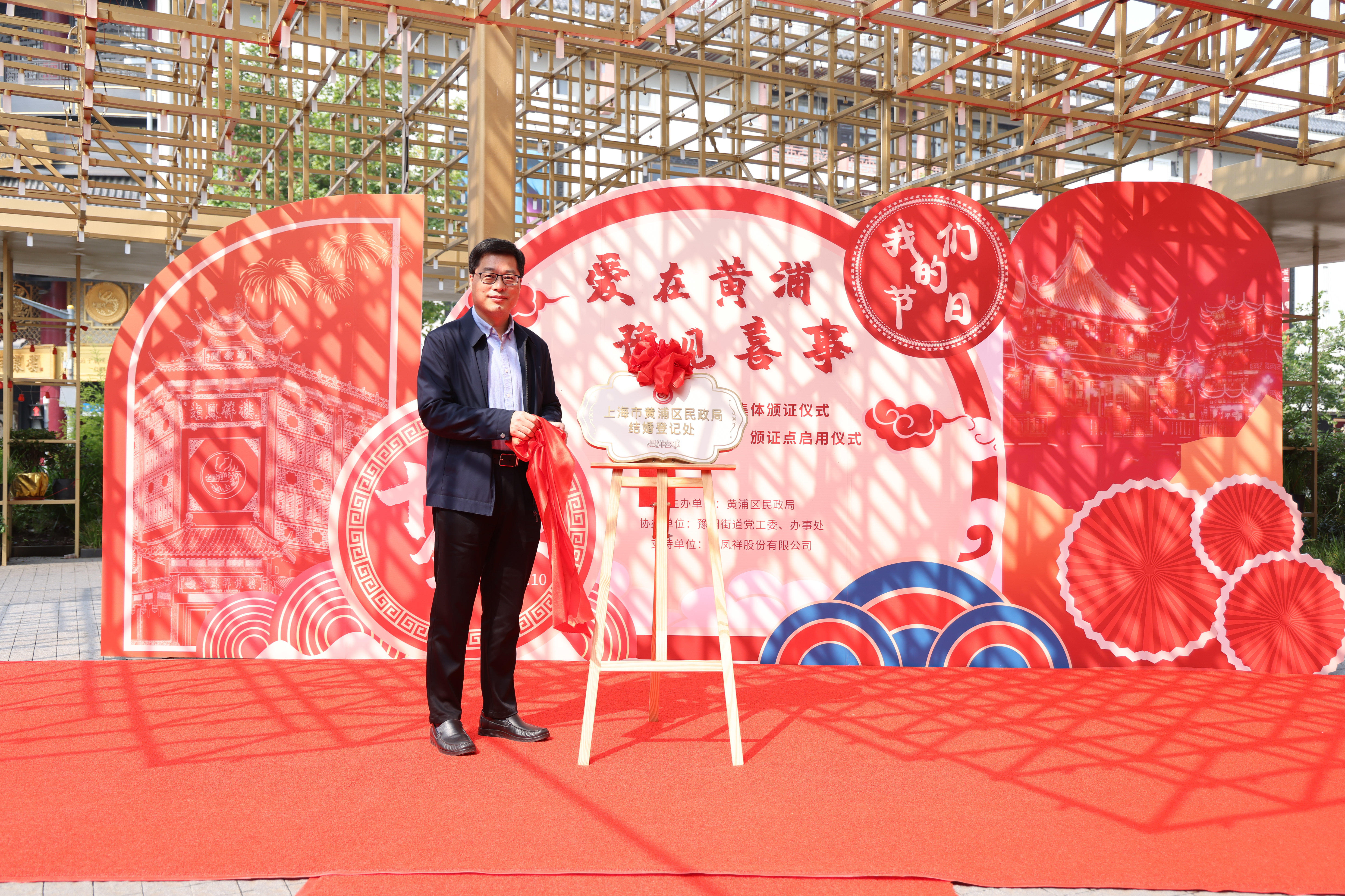 黄浦区副区长王槐为“凤祥喜事”登记点揭牌。