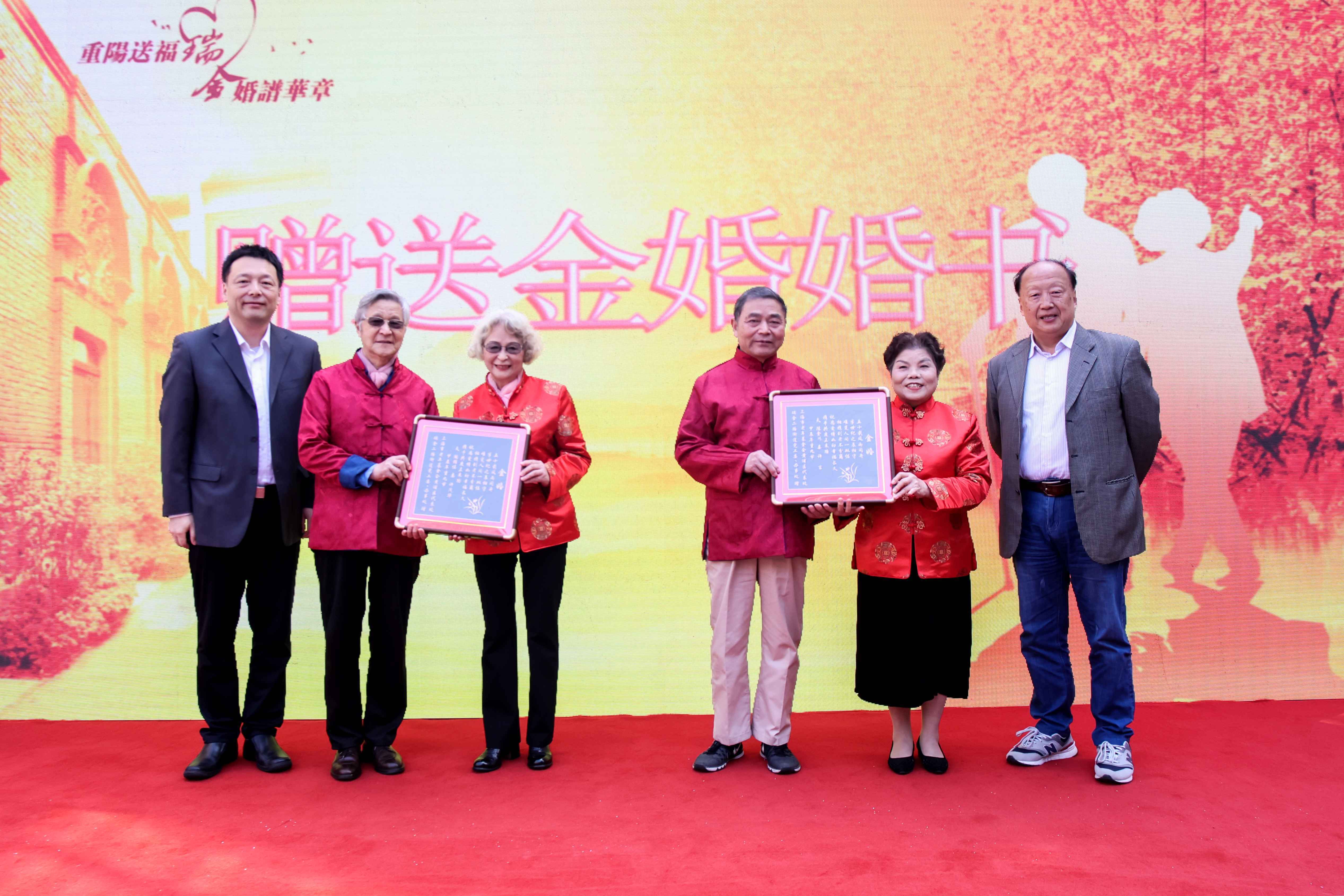 活动以一首《老夫老妻》合唱曲拉开帷幕,社区老年文艺骨干们用婉转悠扬的歌声,传达了对金婚夫妇“同舟共济遮风雨,携手相依度春秋”美满婚姻的赞美。随后,一段短片记录回顾了陈金州、许言和陶锦慎、许茂华两对金婚夫妇“五十载鹊桥共度、半世纪风雨同舟”的爱情故事,及其和睦相伴、细微平淡的老年生活。两对老人还携手登台,分享他们“不老爱情”的保鲜秘诀。上海市老年基金会黄浦区代表处会长彭维新、瑞金二路街道党工委书记任伟峰为两对金婚夫妇颁发象征50年美好婚姻生活的金婚婚书和电子相册,为金婚伉俪送上最真挚的祝福。