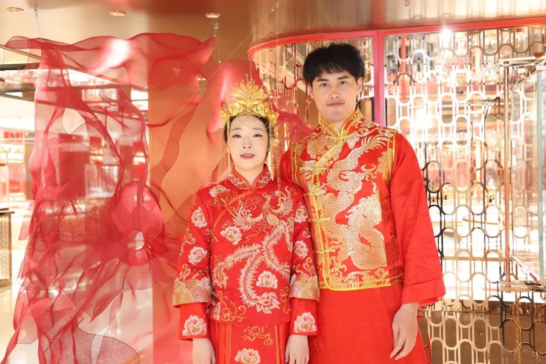 上海市民政局副局长高骥、黄浦区副区长梁栋为新人颁发结婚证书。仪式结束后,新人们手持明信片穿梭在凤祥楼中寻找可爱的“凤祥宝宝”,体验凤冠霞帔,参与打卡集章活动,并与游客和老凤祥的工作人员们互动赠送喜糖,把自己的甜蜜分享给大家。