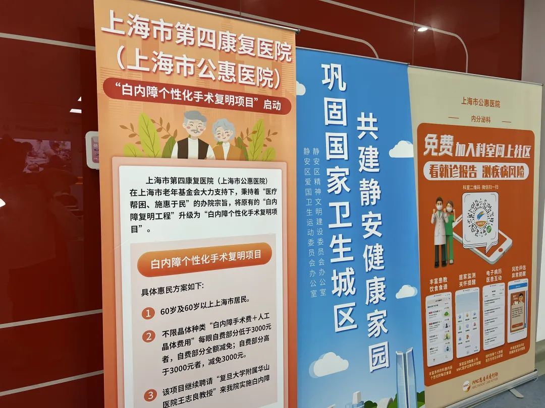 上海市第四康复医院(上海市公惠医院)眼科作为医院的重点专科,长期与“复旦大学附属华山医院眼科”合作,自2012年开始开展“上海市白内障复明项目”白内障手术,是全国率先开展屈光性白内障手术的专业团队之一,已成功为3000多名居民实施了白内障公益手术,得到患者和社会的一致好评。
