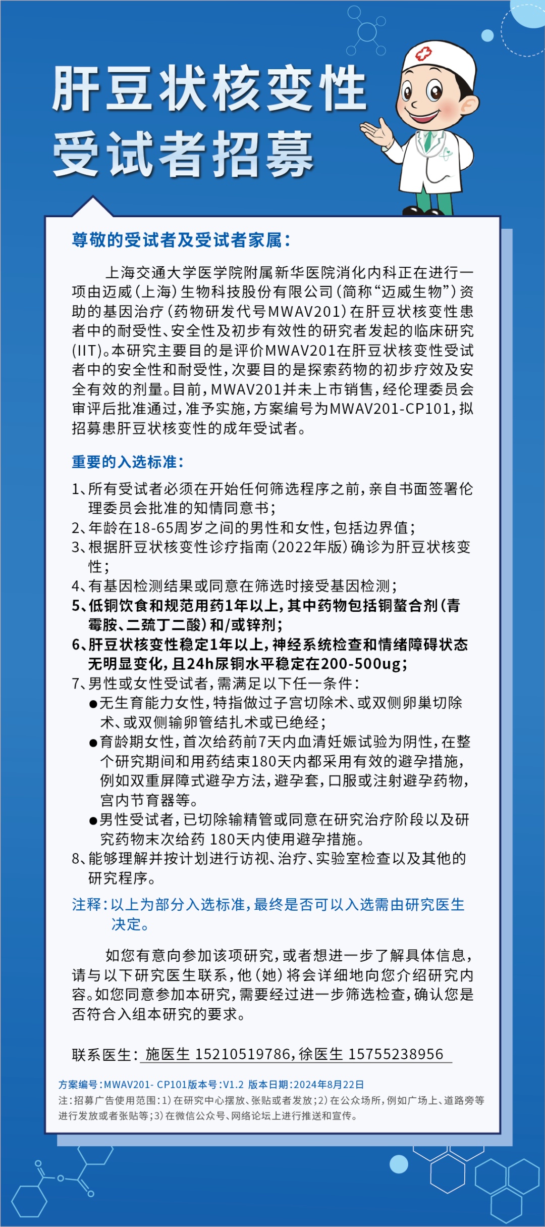 在国家科技重大专项的支持下,上海交通大学医学院附属新华医院消化内科范建高教授与研发企业紧密合作,目前正在开展MWAV201对肝豆状核变性患者耐受性和安全性的探索性研究,旨在让肝豆状核变性患者通过基因治疗而获益。