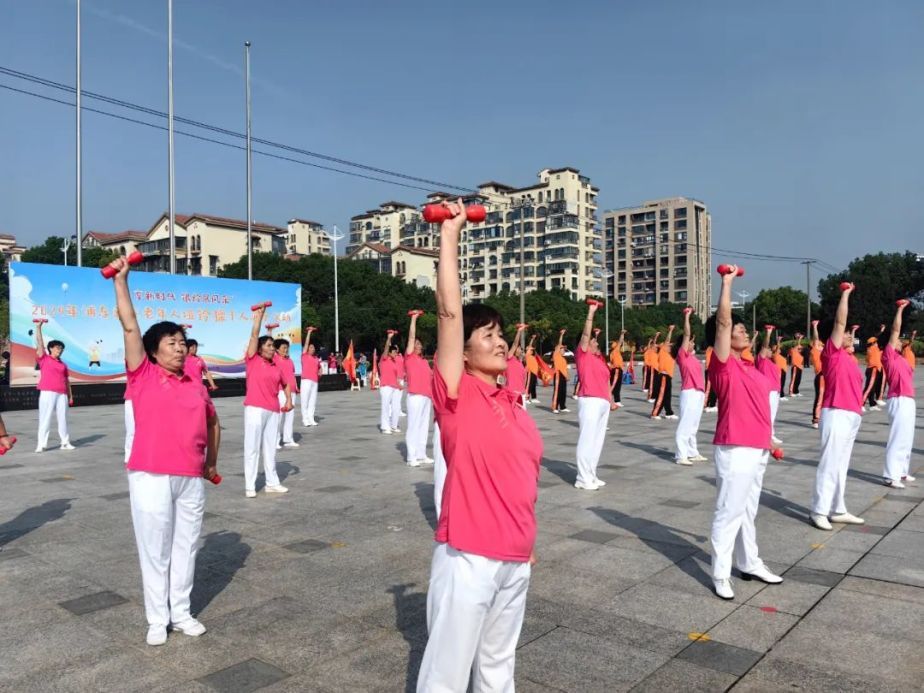 当天,参加展示的各代表队身穿不同队服,四个队一组,分批进行展示。在充满节奏的音乐中,队员们手持哑铃,整齐划一地做出各种动作,让现场充满了活力,体现出老年人的风采。