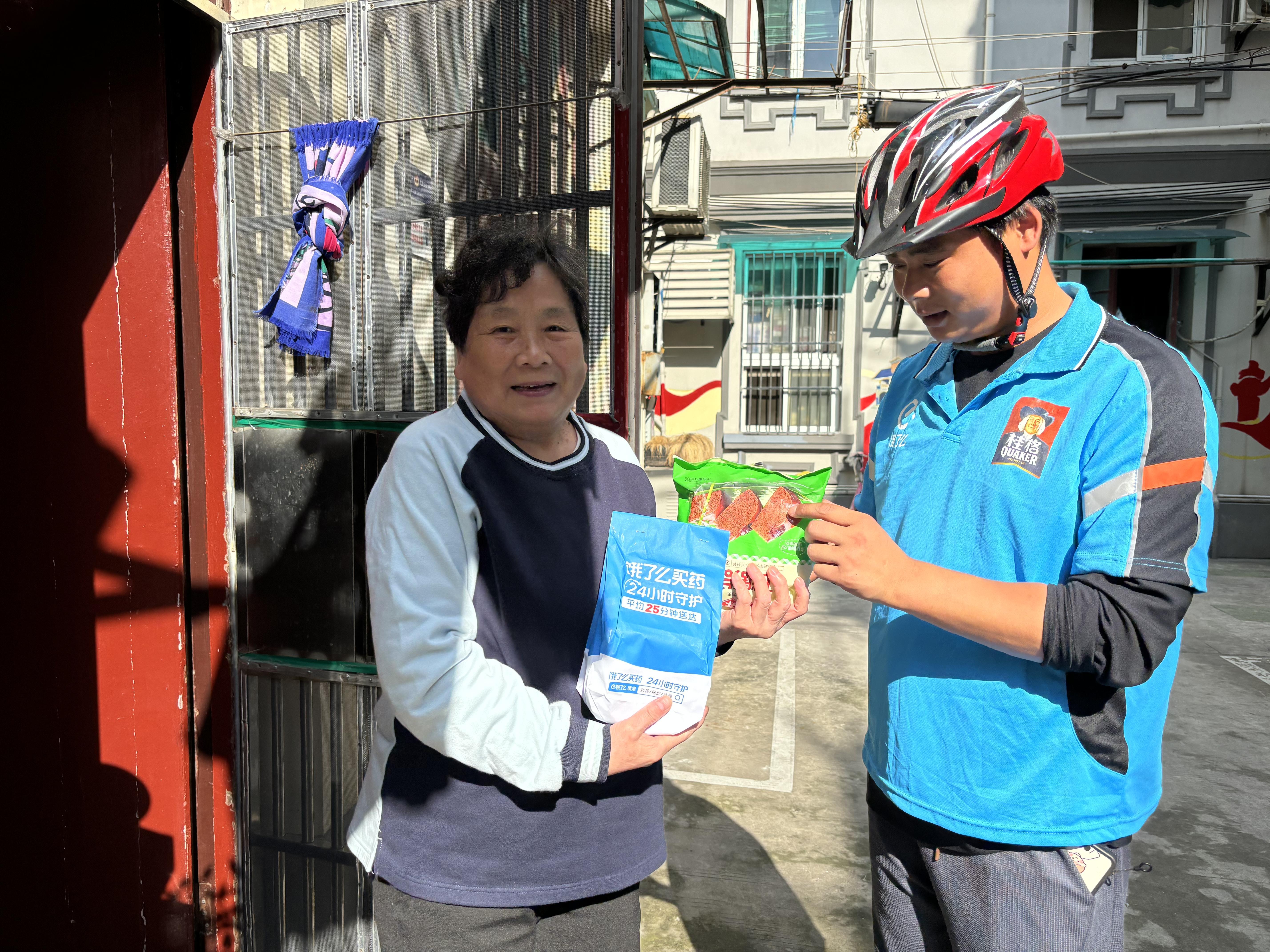 为了表达对社区老人们的敬意和关爱,中华老字号品牌童涵春堂、社会组织浦江汇公益分别提供了秋梨饮和重阳糕,由饿了么“蓝骑士”们免费将这份礼物送到社区100位老人手中。借助饿了么骑手的高效分工,这份爱心的接力当天就已完成。“蓝骑士”们送上门的不仅有可口的点心,更是一份来自社会各界的关爱。事实上,不少承担配送任务的“蓝骑士”与老人之间已是“熟门熟路”,他们以志愿者的身份加入由街道开展的“社区快药”行动,通过和家庭病床老人结对子的方式,提供免费的一对一送药上门服务。