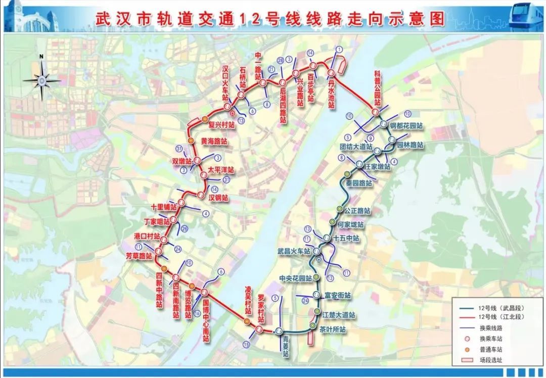 12号线是武汉市首条地铁环线,串联7个中心城区,两次穿越长江,一次穿越汉江,全长约59.9公里,共设车站37座,线路经由常青一路——后湖大道——兴业路——园林路——团结大道——沙湖大道——东安路——武昌火车站——平安路——白沙三路——四新南路——芳草路——赫山路——琴台大道——汉西路——常青一路,最终闭合成环。建成后将有效缓解城市中心区客流压力,提升环线客流吸引力,加快城市重点发展地区建设、完善城市综合交通体系。