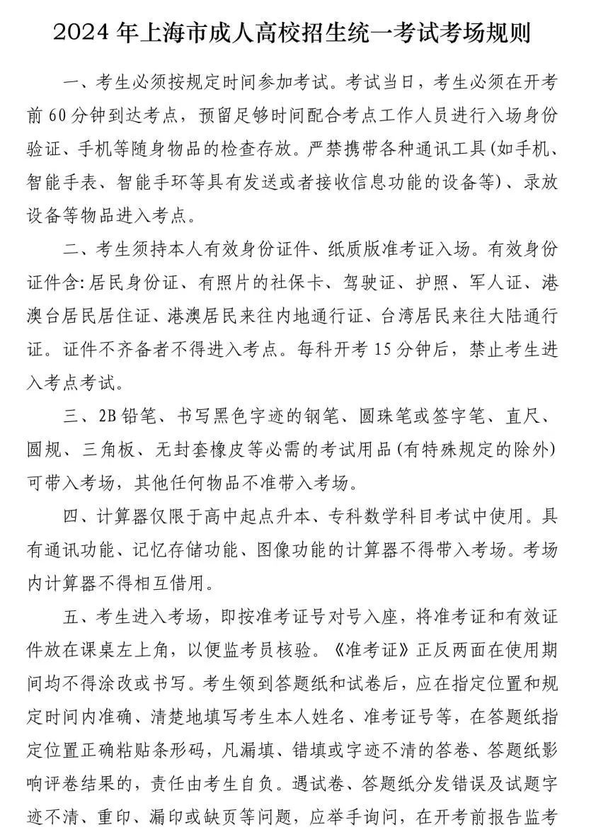 2024年上海市成人高校招生统一考试将于10月19日(星期六)、20日(星期日)举行。为营造公平安全的考试环境,按教育部统一要求,本市将实施考点和考场“二次安检”,考生不可携带手机等各种具有发送或者接收信息功能的设备进入考点(或考点内封闭区)。现将考试有关事项提醒如下: