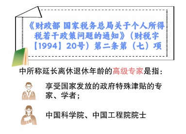 二、根据《财政部 国家税务总局关于个人所得税若干政策问题的通知》(财税字[1994]20号)第二条第(七)项规定:“对按国发〔1983〕141号《国务院关于高级专家离休退休若干问题的暂行规定》和国办发〔1991〕40号《国务院办公厅关于杰出高级专家暂缓离退休审批问题的通知》精神,达到离休、退休年龄,但确因工作需要,适当延长离休退休年龄的高级专家(指享受国家发放的政府特殊津贴的专家、学者),其在延长离休退休期间的工资、薪金所得,视同退休工资、离休工资免征个人所得税。”