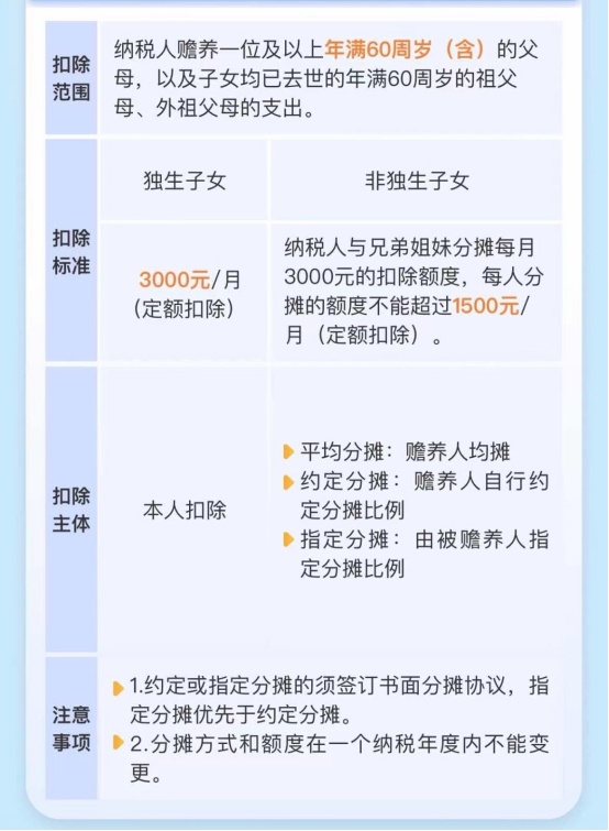2023年1月1日起,纳税人为独生子女的,按照每月3000元的标准定额扣除;纳税人为非独生子女的,由其与兄弟姐妹分摊每月3000元的扣除额度,每人分摊的额度不能超过每月1500元。可以由赡养人均摊或者约定分摊,也可以由被赡养人指定分摊。约定或者指定分摊的须签订书面分摊协议,指定分摊优先于约定分摊。具体分摊方式和额度在一个纳税年度内不能变更。