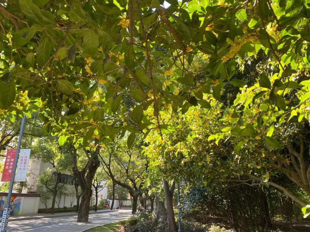 漫步在松江街头巷陌,随处可见桂花树。在松江市民广场北侧的马路上,人行道两侧种满了桂花树。树冠对接成廊,春夏葱葱郁郁,入秋繁花满枝,形成了一条桂花长廊。行人车辆伴着桂香穿梭在桂影婆娑间,骑行道在一长段林荫道中蜿蜒,风拂过面颊,猛吸一口,进入鼻腔的都是清甜。