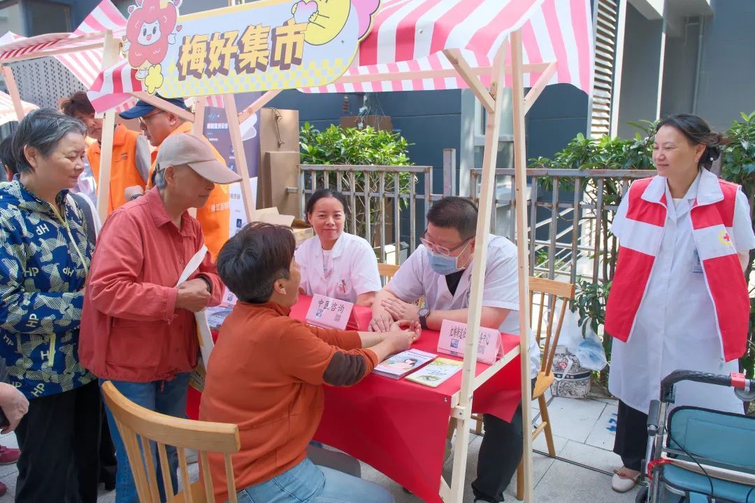 在“梅好集市”上,各类摊位琳琅满目,热闹非凡。高血压、心理健康咨询、口腔健康、中医耳穴保健、家庭照护咨询等摊位前,专业医护人员和志愿者们耐心地为居民们答疑解惑,提供健康指导。反诈宣传摊位则通过生动的案例讲解,增强老年人的防骗意识。公益理发、磨剪刀等便民服务也深受居民们的喜爱,大家纷纷排队等候,享受着这份来自社区的贴心关怀。