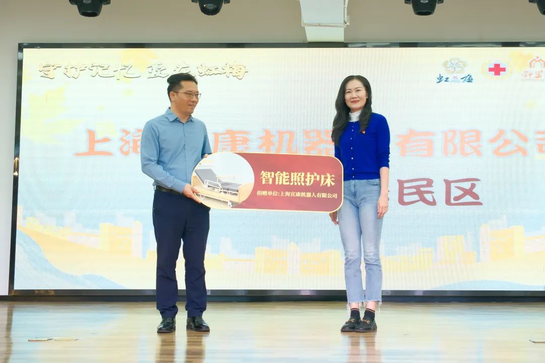 颐家项目负责人展示了2024年虹梅街道“老吾老计划”的丰硕成果,展现了街道在关爱老年人方面的不懈努力与显著成效。爱心企业上海宣康机器人有限公司和上海农商行,分别向航天新苑捐赠智能照护床,向古美小区行动不便的老年人捐赠50份家政服务,用实际行动为社区长者送去关爱与帮助。
