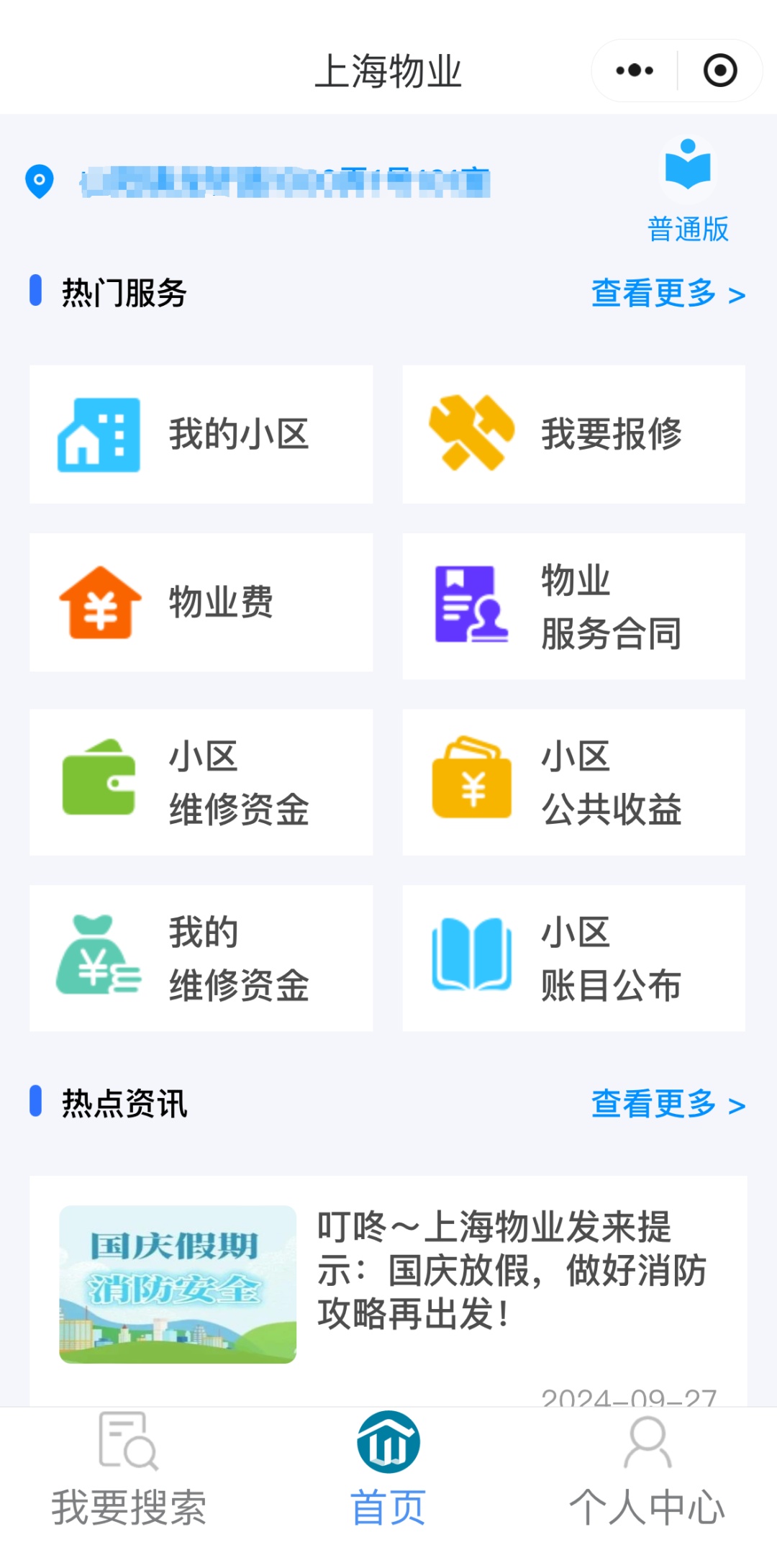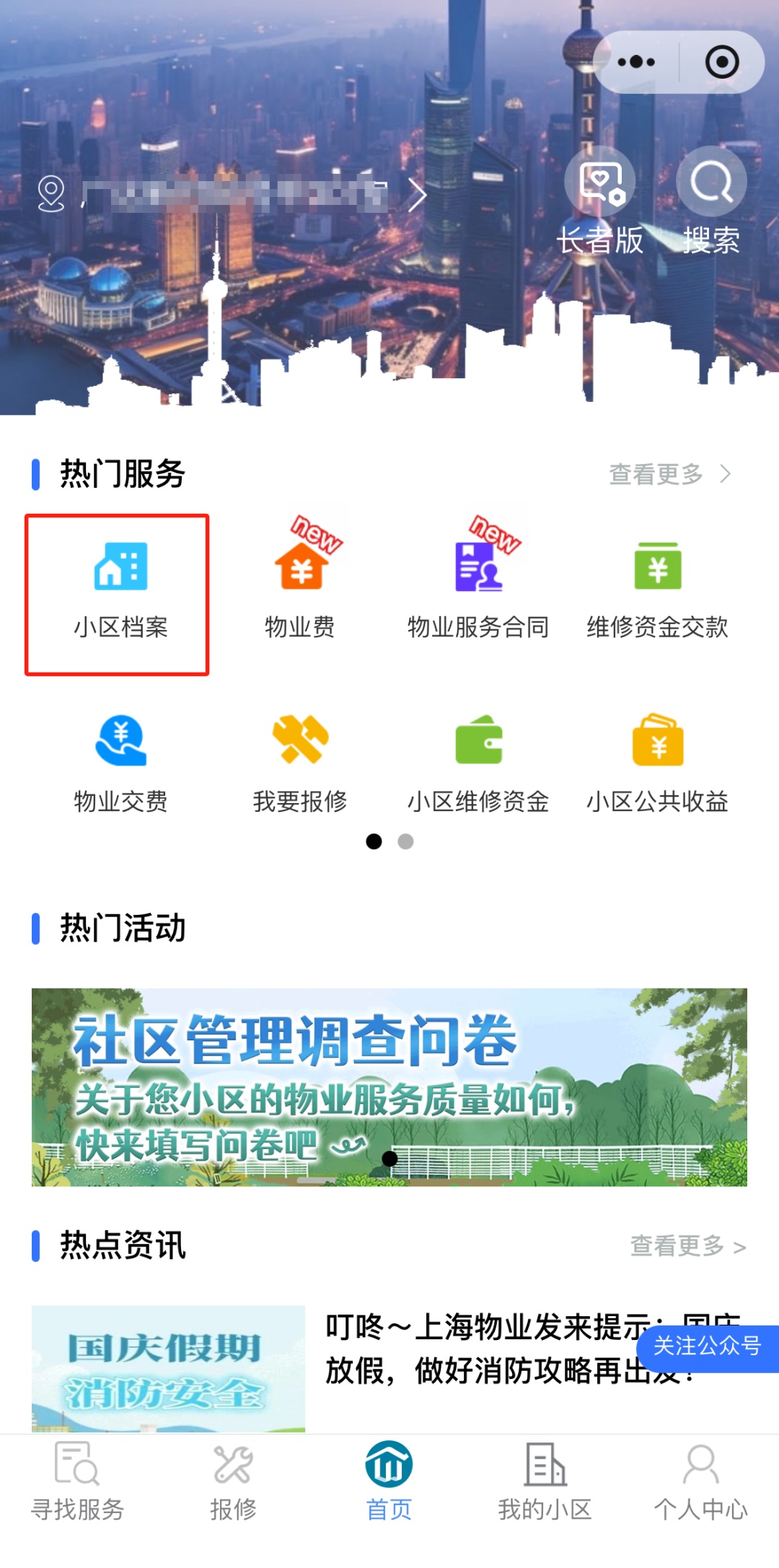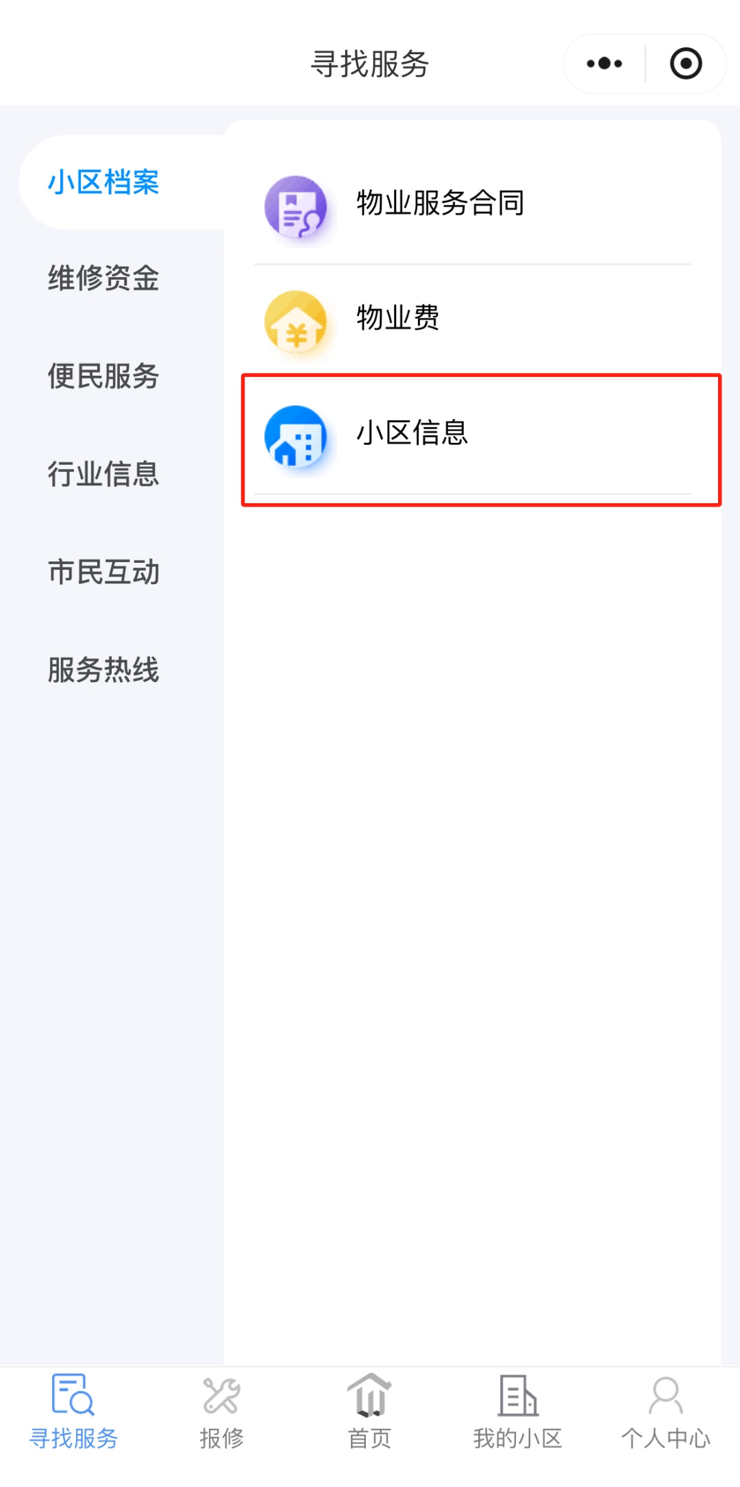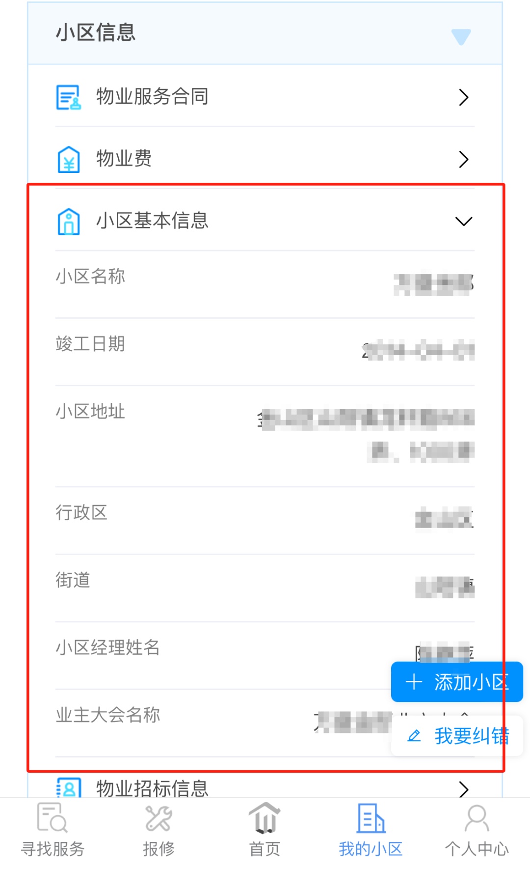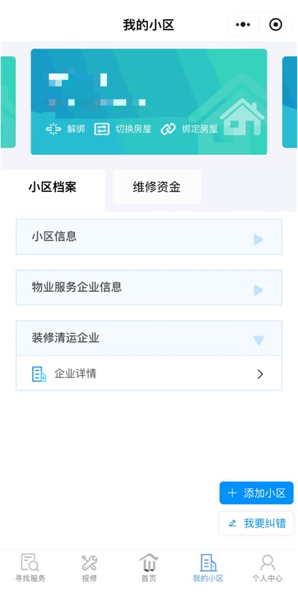 首页点击“小区档案”,可查看绑定小区的地址、街道等基本信息,还可查看物业服务合同、物业费和维修资金。