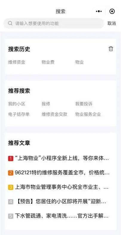 使用“搜索栏”功能,可快速搜索需要使用的功能,还可查看搜索历史、推荐搜索、推荐文章,符合个性需求,实现一键直达!