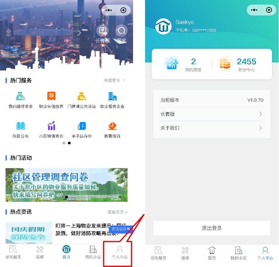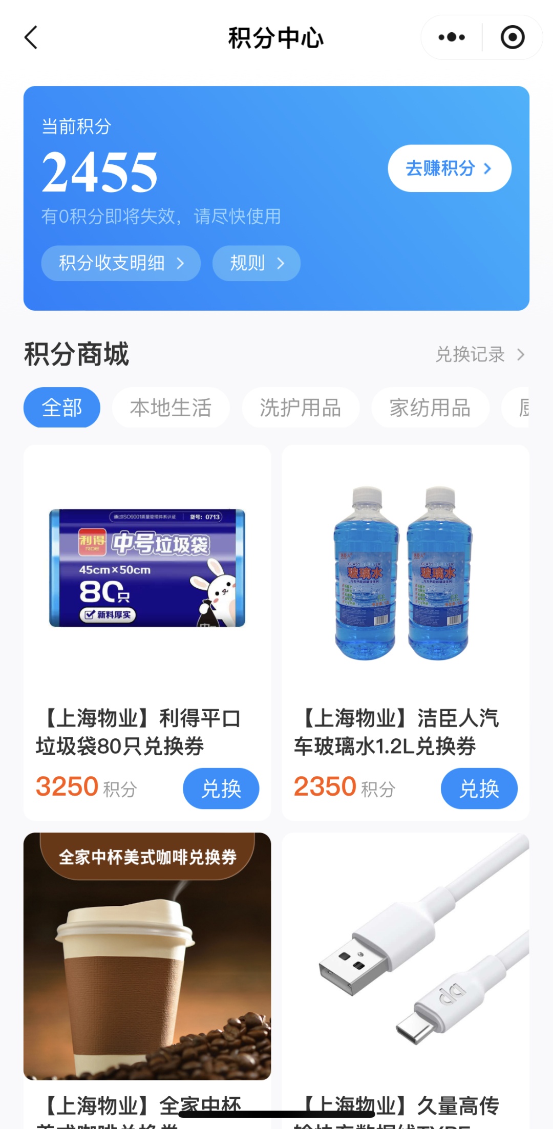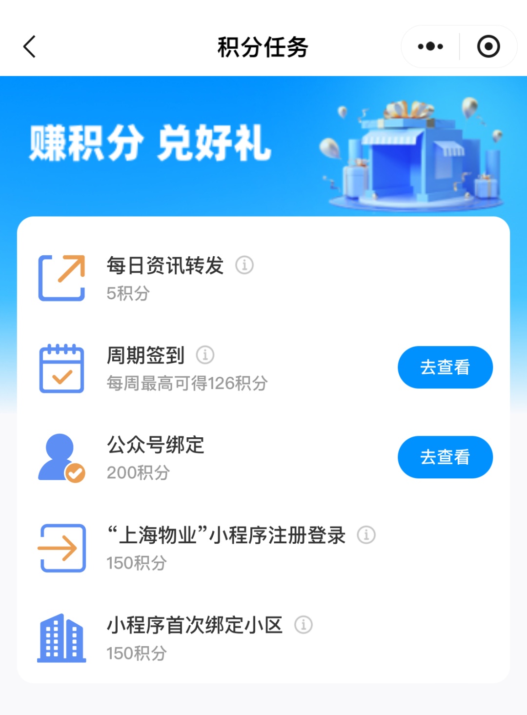 “上海物业”小程序注册登录、小程序首次绑定小区、公众号绑定、周期签到以及每日资讯转发均可得到相应的积分。拼团、拉新活动也会不定期开展。