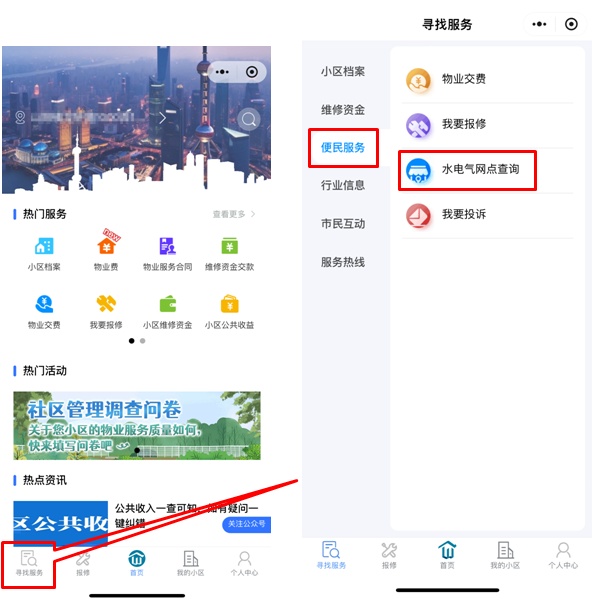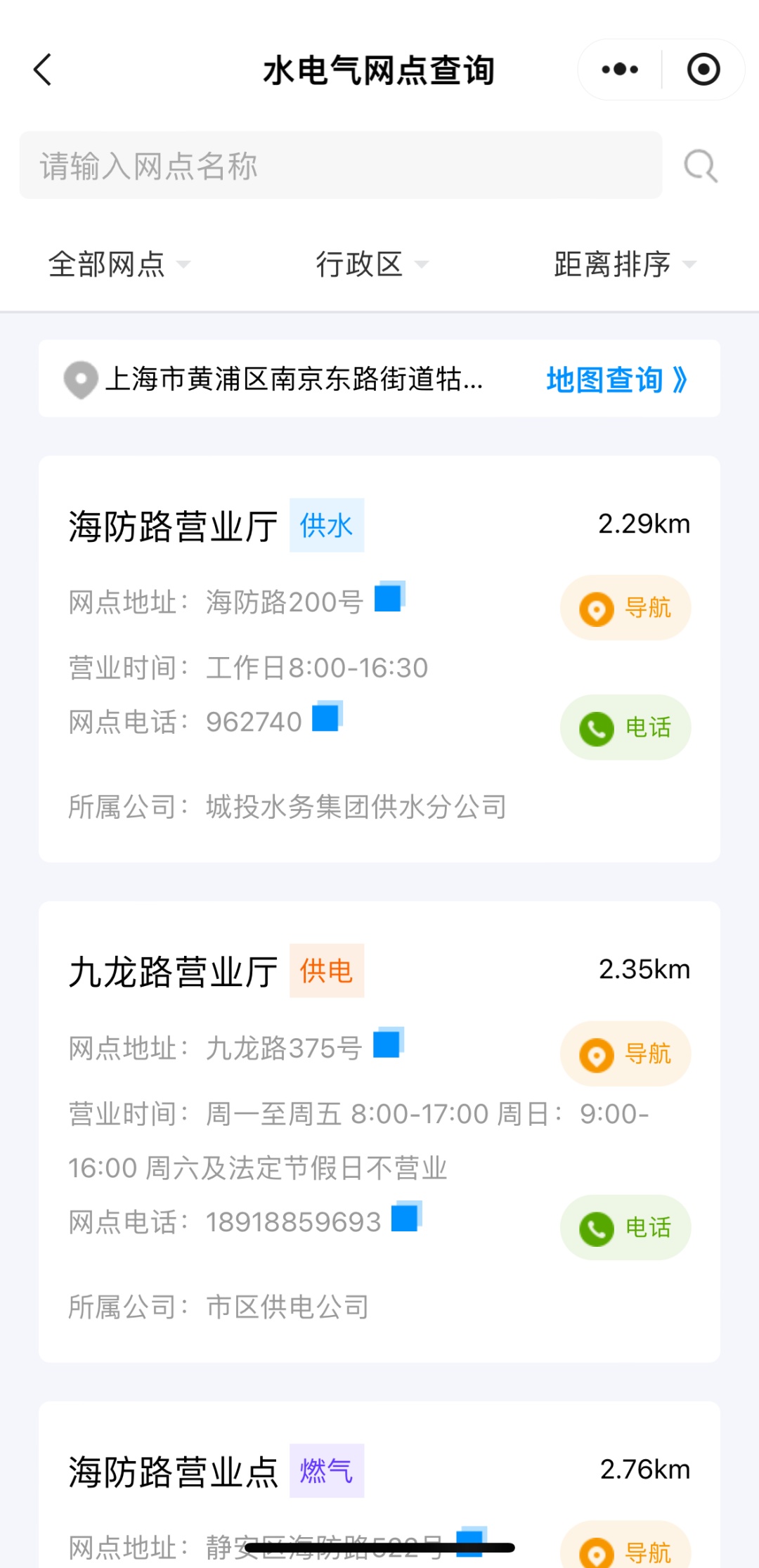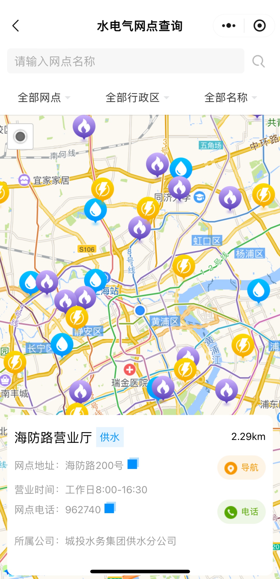 首页左下角点击“寻找服务”-“便民服务”-“水电气网点查询”,通过列表或地图形式查看上海市水电气网点信息,也可以快速导航或拨打网点电话。