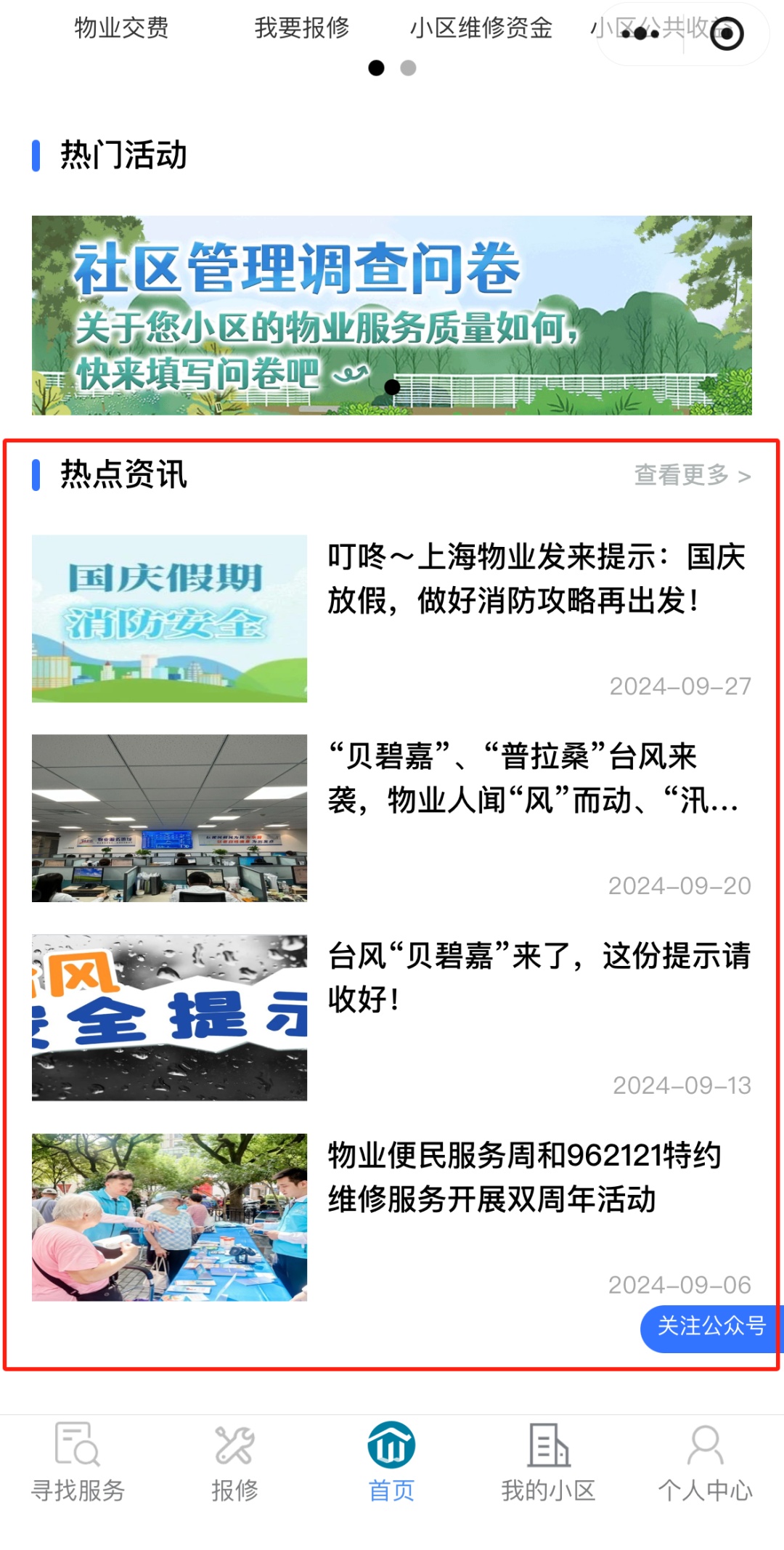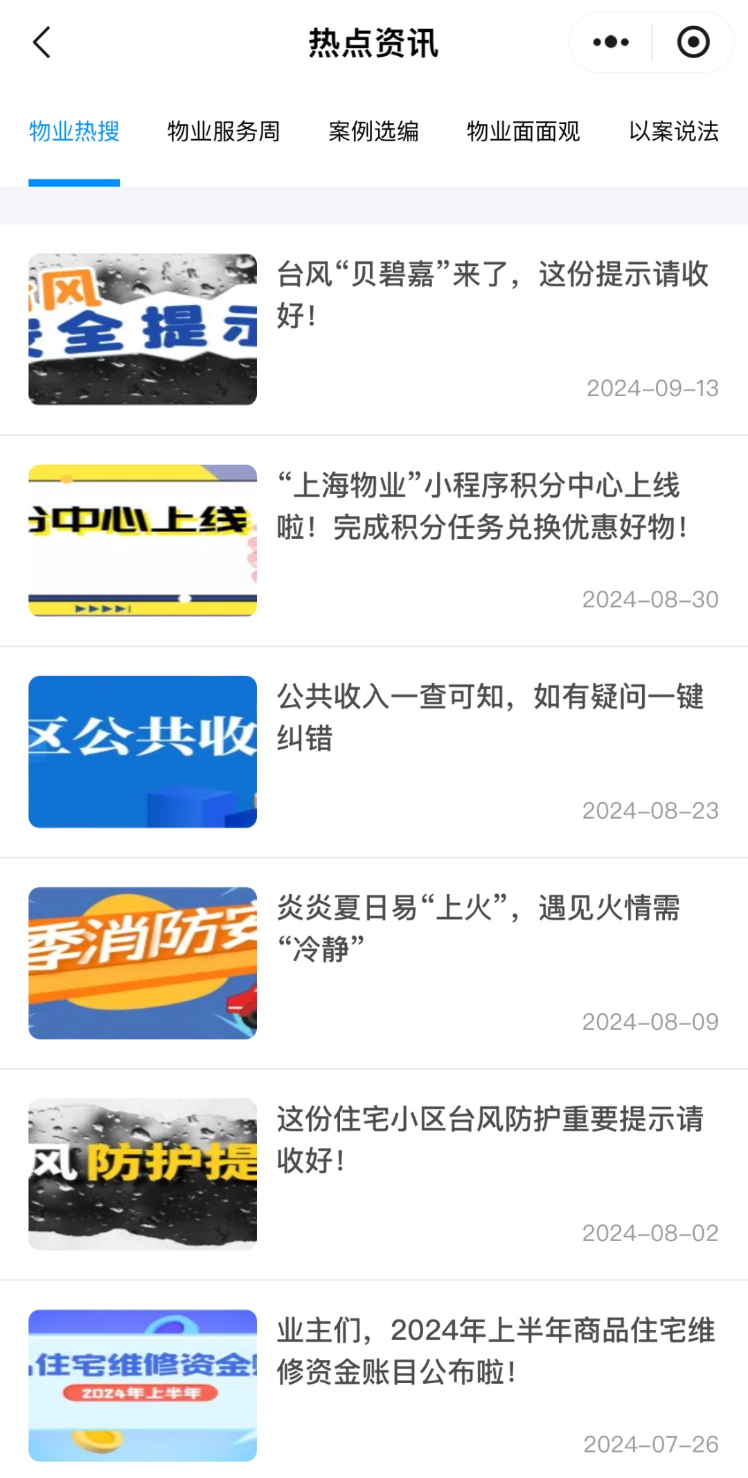 首页展示物业类热点资讯,点击更多还可查找分类明确的文章资讯。
