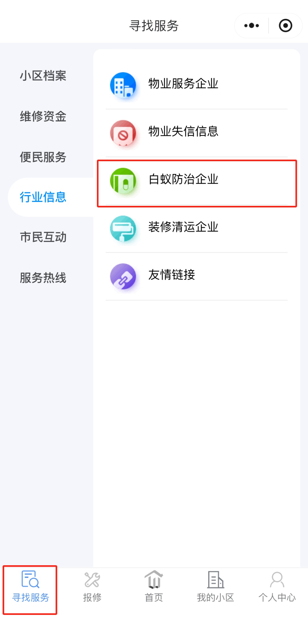 首页左下角点击“寻找服务”-“白蚁防治企业”查询到上海市物业管理行业协会白蚁防治专业委员会会员单位,联系这些企业上门灭治白蚁。