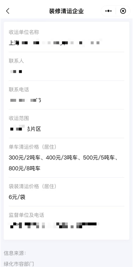 可通过“我的小区”-“小区档案”-“装修清运企业”查询到已绑定小区的清运企业信息,快速联系企业来清运。(清运企业由各区绿化市容部门通过招投标方式确认)