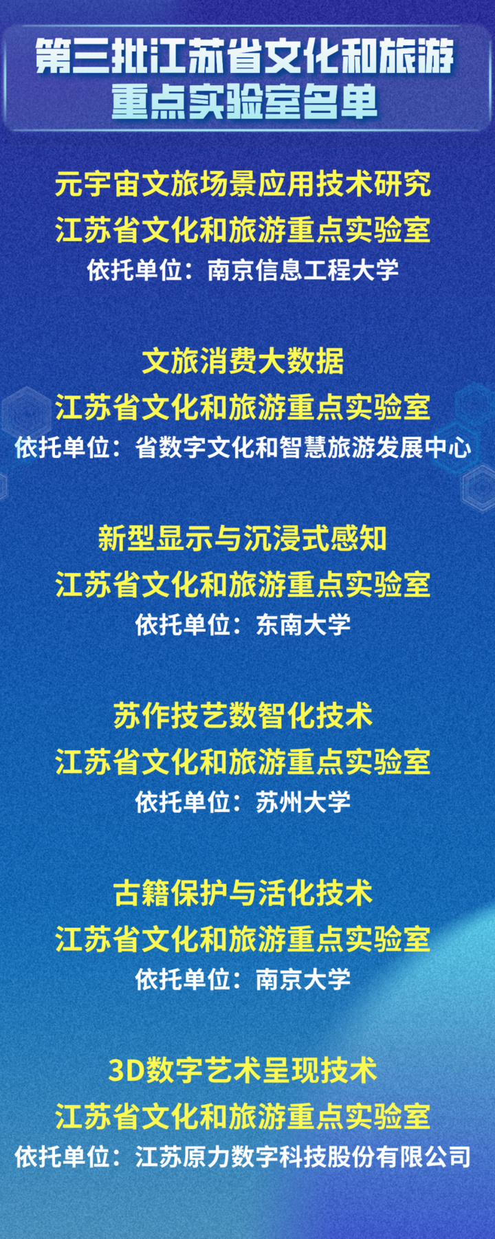 文旅重点实验室是江苏省文旅科技创新体系的重要组成部分,是健全文化和科技融合协同创新机制的重要平台。近日,省文化和旅游厅公布第三批江苏省文化和旅游重点实验室名单,共有6家实验室入选。截至目前,江苏已建成国家级文化和旅游重点实验室3个,省级文化和旅游重点实验室15个,数量位居全国前列。文旅重点实验室如何依托大学、研究机构和企业,运用前沿科技和数字技术,赋能文旅融合,引领文旅新风尚,打造文旅消费新场景,新华日报·交汇点记者带着这个问题进行了采访。