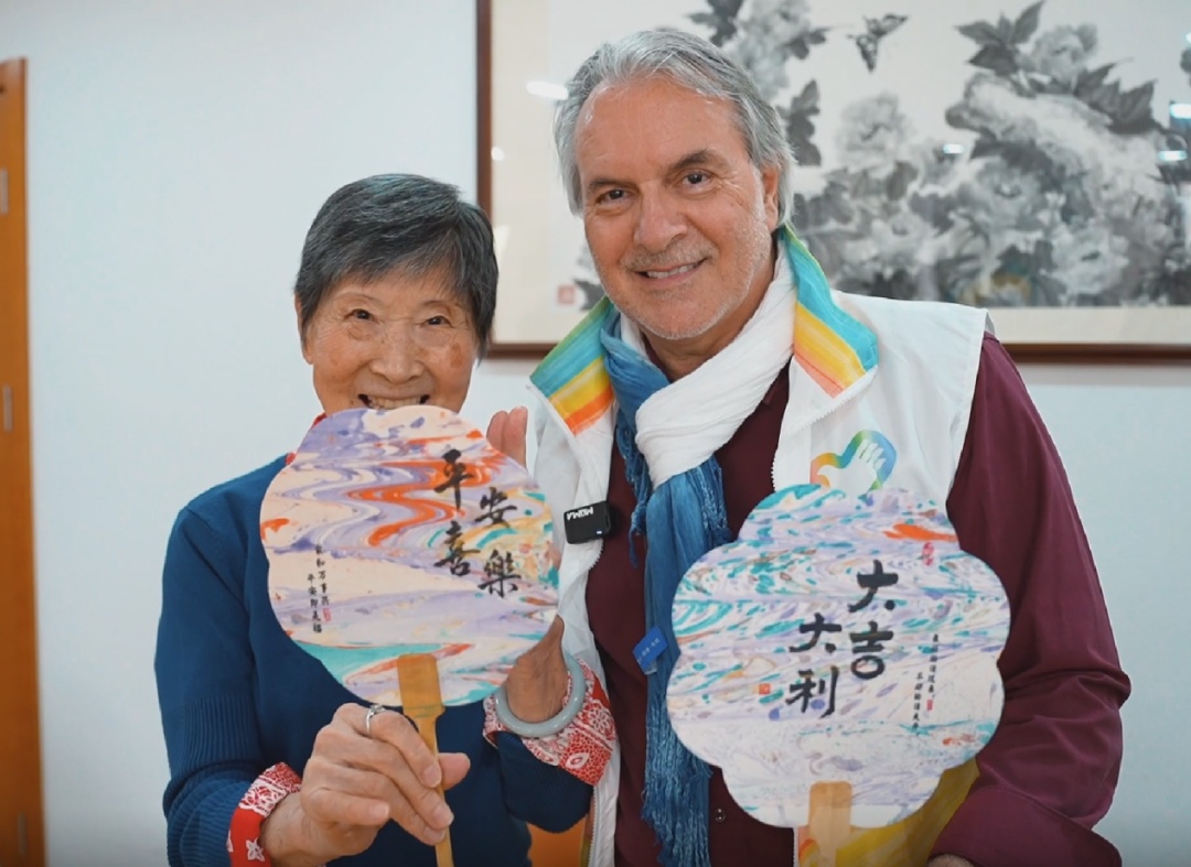 在中国传统文化中,扇子被赋予了人文价值,古人会相互赠扇。现场,外籍志愿者和老人们互相赠扇,见证着跨越时代、地域的情感和友谊。