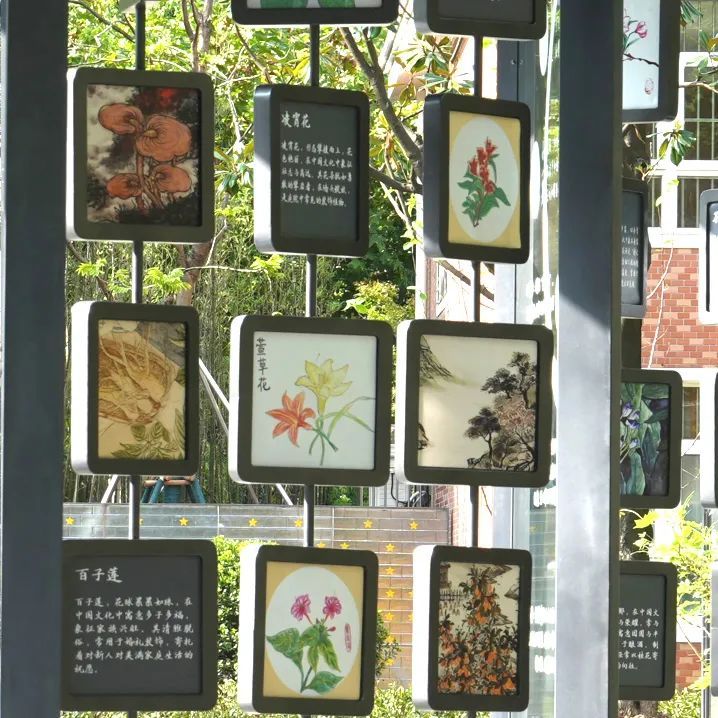 阳光草坪东侧设置科普廊架和儿童乐园,开阔视线及座椅设施让家长看护儿童玩耍更安心。科普廊架与街道共治,展示二十四节气推荐使用的中草药画作,让市民深入了解药用植物的科学知识,画作均由市民及学生手绘而成。