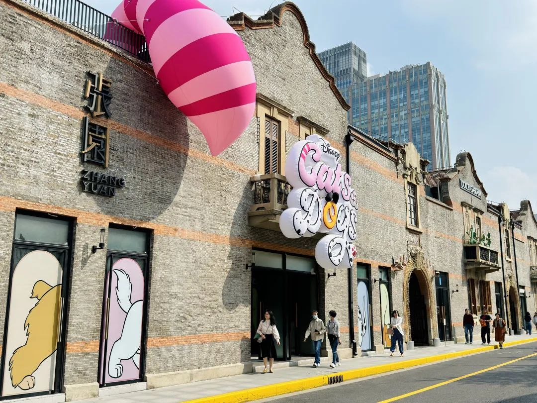 “小姐与流氓”在石库门下欢乐合体,“玛丽猫”与“101忠狗”于天井转角开启邂逅,“布鲁托”在园中欢乐嬉戏,会微笑的“柴郡猫”从爱丽丝仙境出逃……无论是巨大的气膜装置还是“毛孩子”橱窗,无不吸引路过的市民纷纷驻足拍照,定格一个个萌力可爱的瞬间。