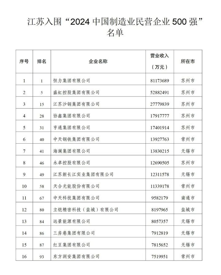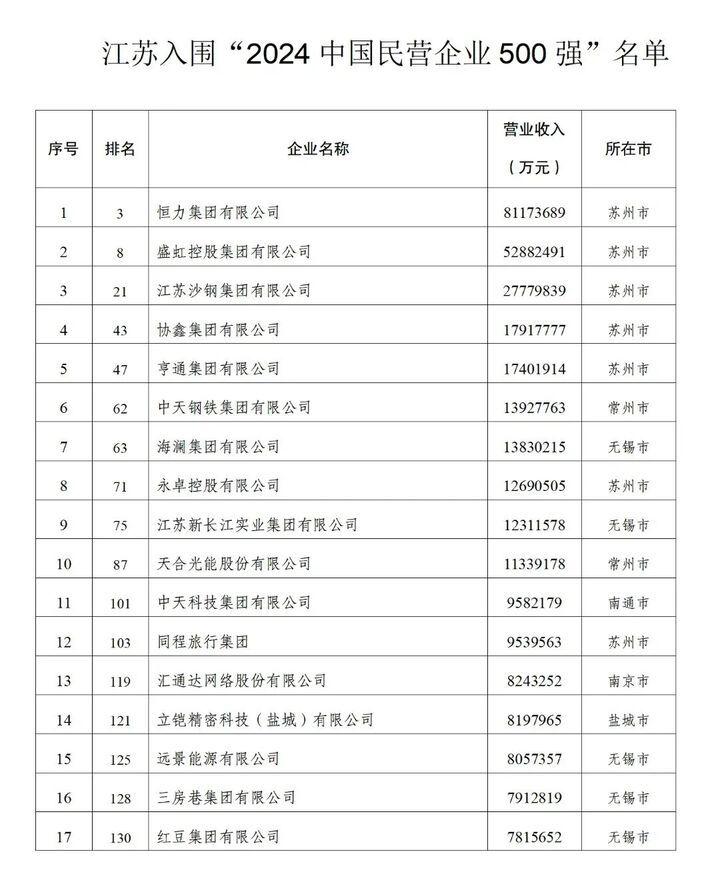江苏89家民营企业入围“2024中国民营企业500强”,与去年持平。79家企业入围“2024中国制造业民营企业500强”,13家企业入围“2024中国服务业民营企业100强”,江苏再次展现了民营经济的强大实力。