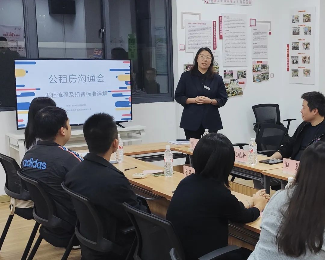 会上,荣和公司第二区域经理祁菊向在场居民代表详细介绍退房前应完成的准备工作和扣费标准,并通过播放实地拍摄的退房视频直观地向在座各位展示工作人员如何进行退房验收。针对窗帘、墙面等容易产生扣费的区域,以图片形式展示不同损耗程度的扣费标准。