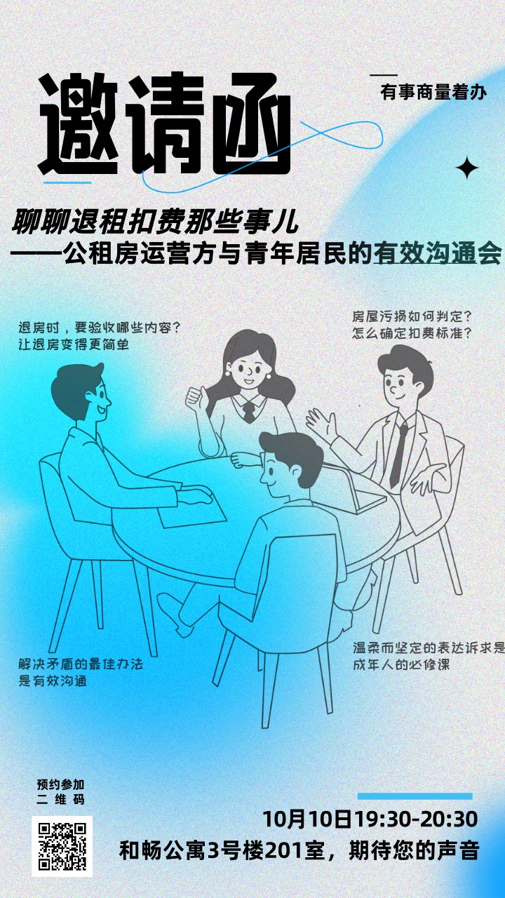为了回应居民的关切,消除大家不必要的顾虑,构建一个更加开放透明的沟通环境,和畅公寓治理委员会的同志联系了长风新村街道,希望能搭建议事协商的平台,并邀请和畅公寓运营方荣和公司的相关负责人、居民代表以及居委会成员,召开线下沟通协调会,为入住的青年人才与公租房运营方提供一个面对面交流的机会。