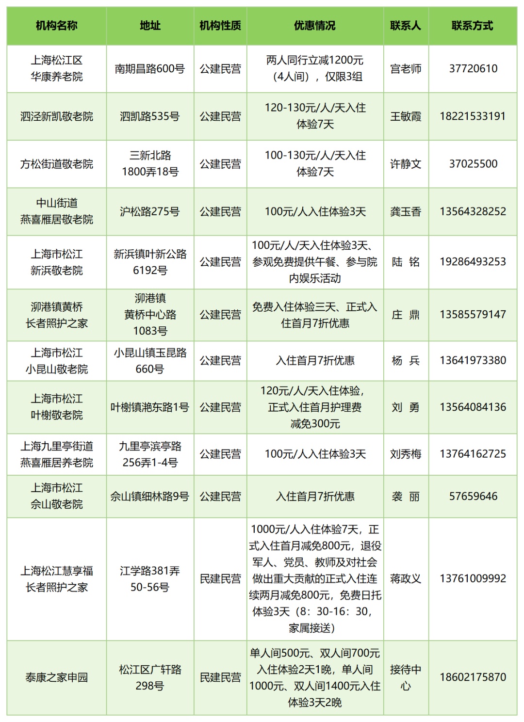 据了解,本次推出入住体验优惠活动的养老机构包括上海松江区华康养老院、泗泾新凯敬老院、方松街道敬老院、中山街道燕喜雁居敬老院、上海市松江新浜敬老院、泖港镇黄桥长者照护之家、上海市松江小昆山敬老院等共12家,其中10家公建民营机构,2家民建民营机构。
